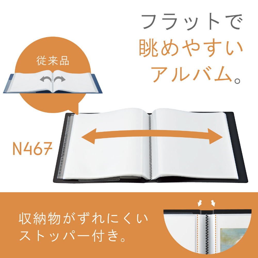 独自のポケット溶着でポケットがフラットに開き閲覧しやすくなっています。また、溶着部分がストッパーになっているので、ポストカードが中央にズレにくく、めくりやすくなっています。