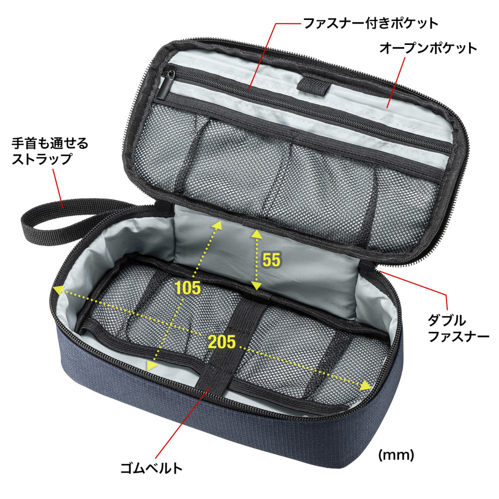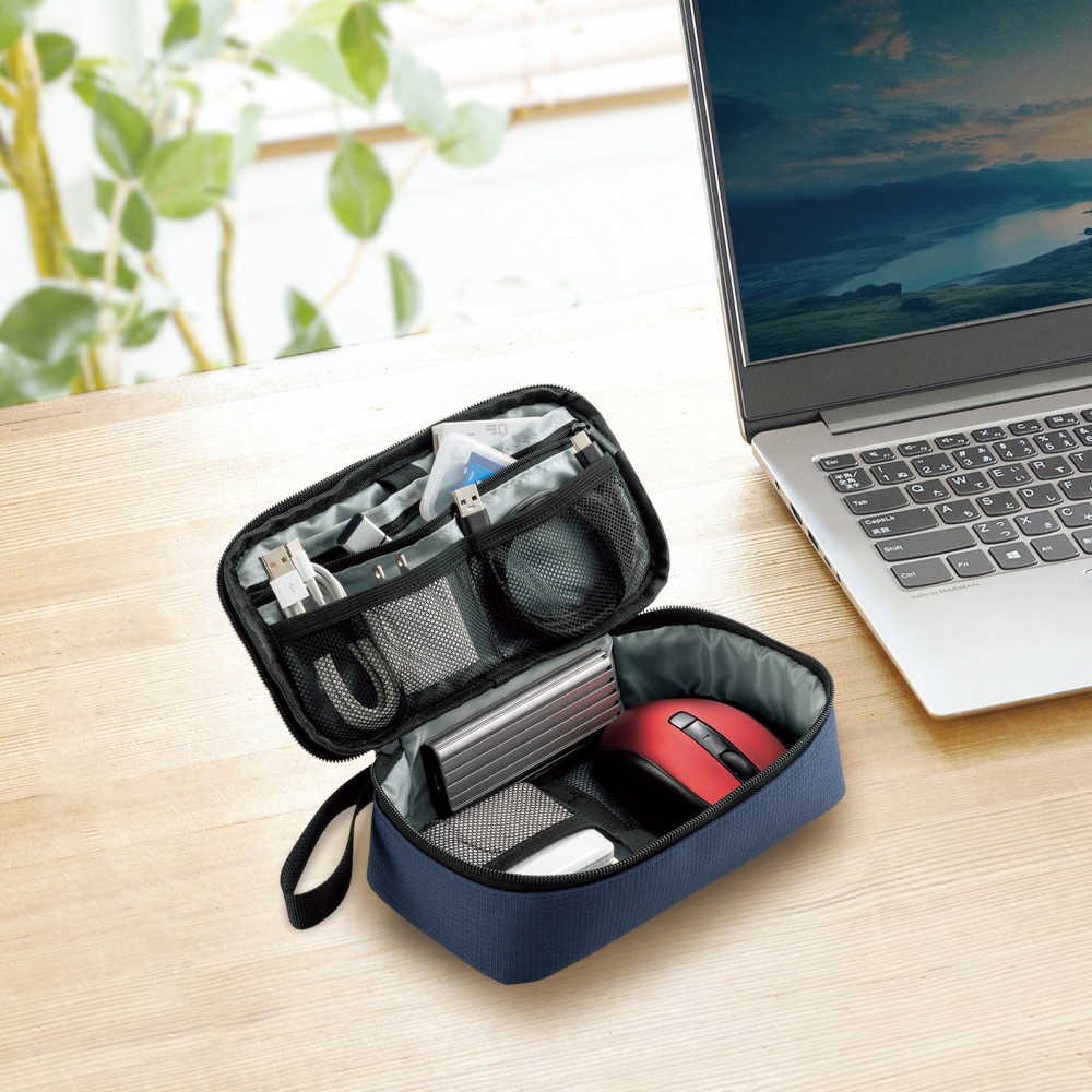 モバイルバッテリーやアダプタなどの小物をまとめてすっきり整理収納できるコンパクトポーチ。幅215×奥行115×高さ65mm。