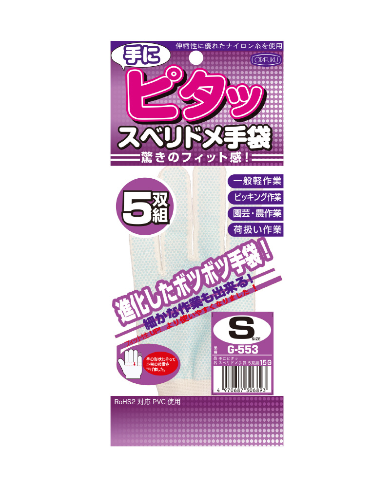 ●一般軽作業・ピッキング作業・園芸作業・農作業におすすめの手にピッタリとフィットするスベリ止め手袋。3双組●材質:手袋/ナイロン100% スベリ止部/塩化ビニル樹脂●サイズ:S