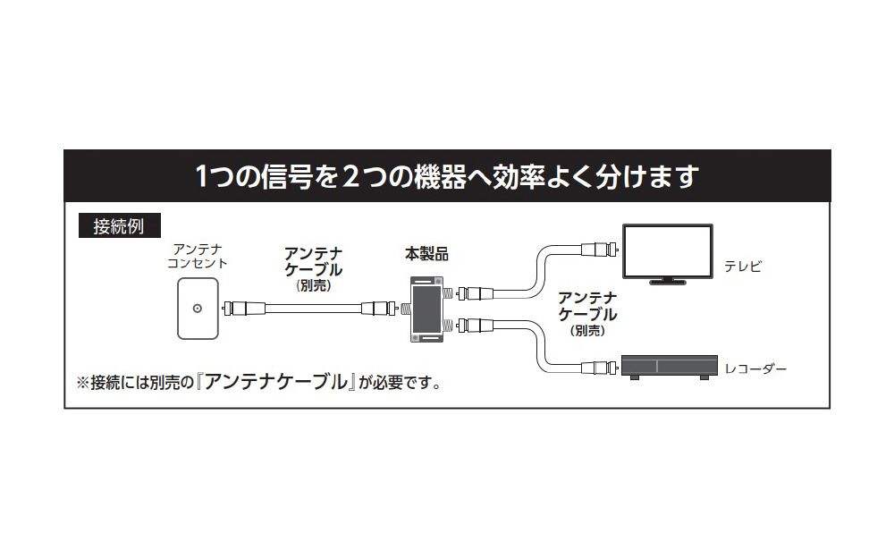 1つのアンテナ信号を効率良く分配します。本製品を使用することにより、レコーダーなどの周辺機器や、別室にあるテレビなど、2台の機器へ分配した信号を送ることが可能になります。
