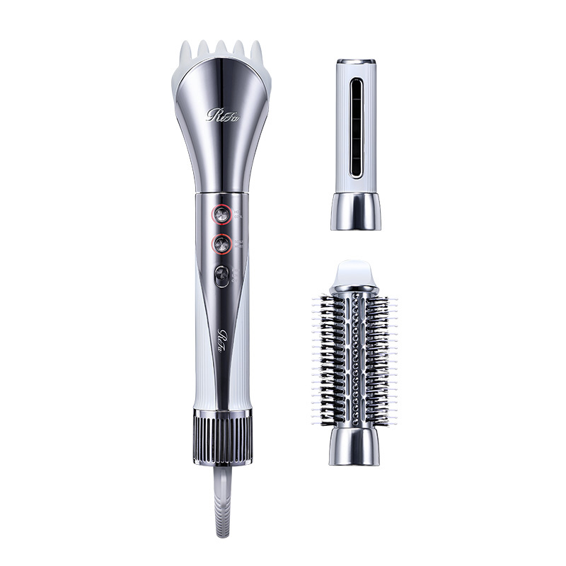 白いピンで髪を粗く梳かしながら、細く密度の高い豚毛とナイロン毛が髪をとらえてツヤを出し、毛先は自然にカール。お手入れ時の熱から顔を保護する背面カバーが、快適なスタイリングをサポートします。