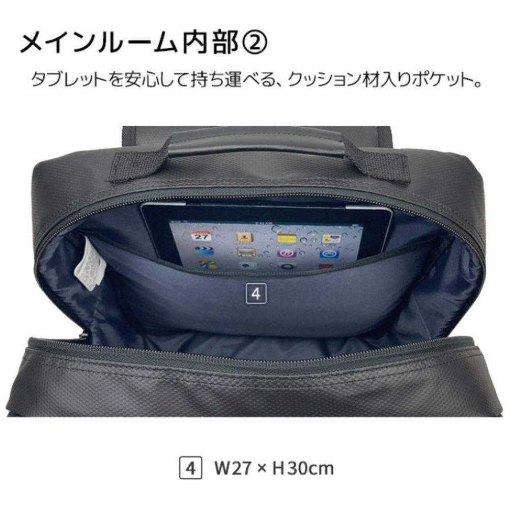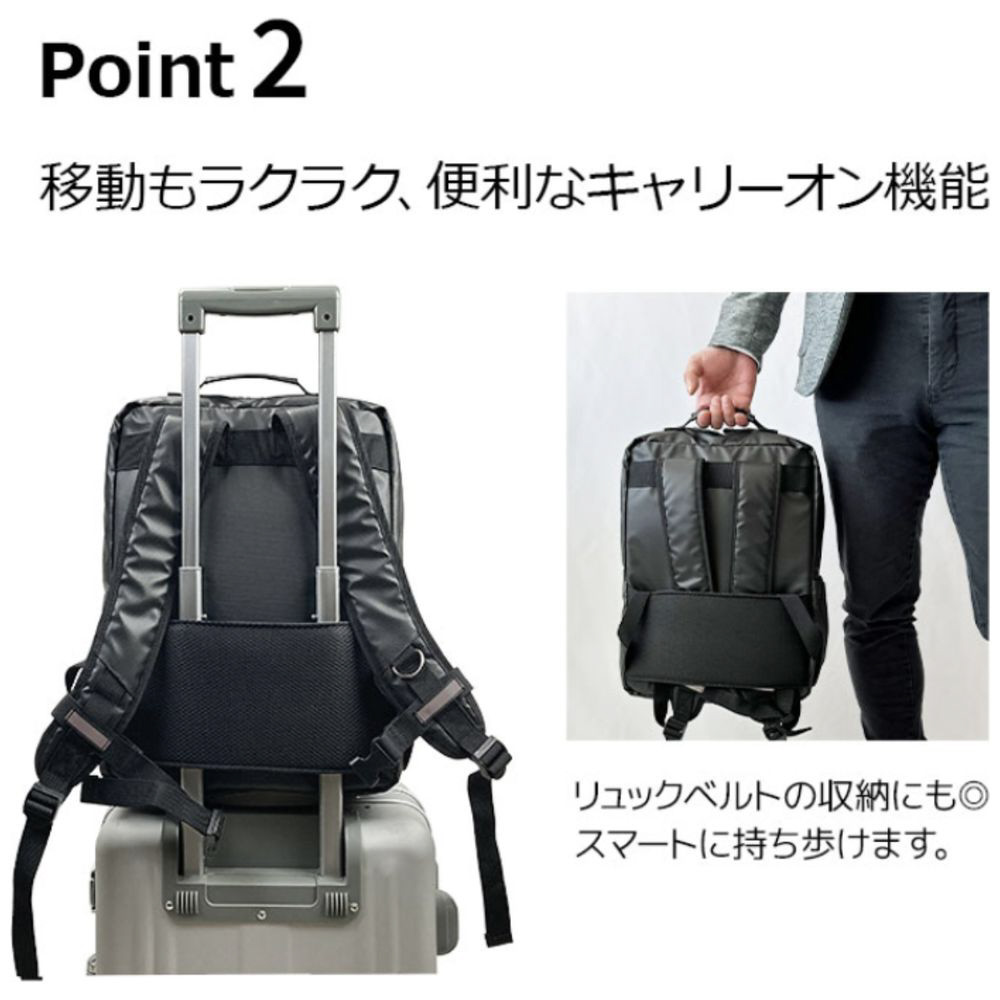 タブレット専用収納を含む多彩なポケットを搭載し、小物から大きめの荷物まで整理しやすいデザイン。さらにキャリーオン対応のループ付きで、旅行や出張時にも便利です。リュックベルトは収納可能で、スマートに持ち運びが可能。