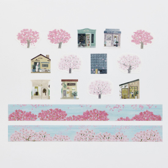 桜とおしゃれなお店のロールステッカーと、満開な桜並木の川のテープの2本セット。