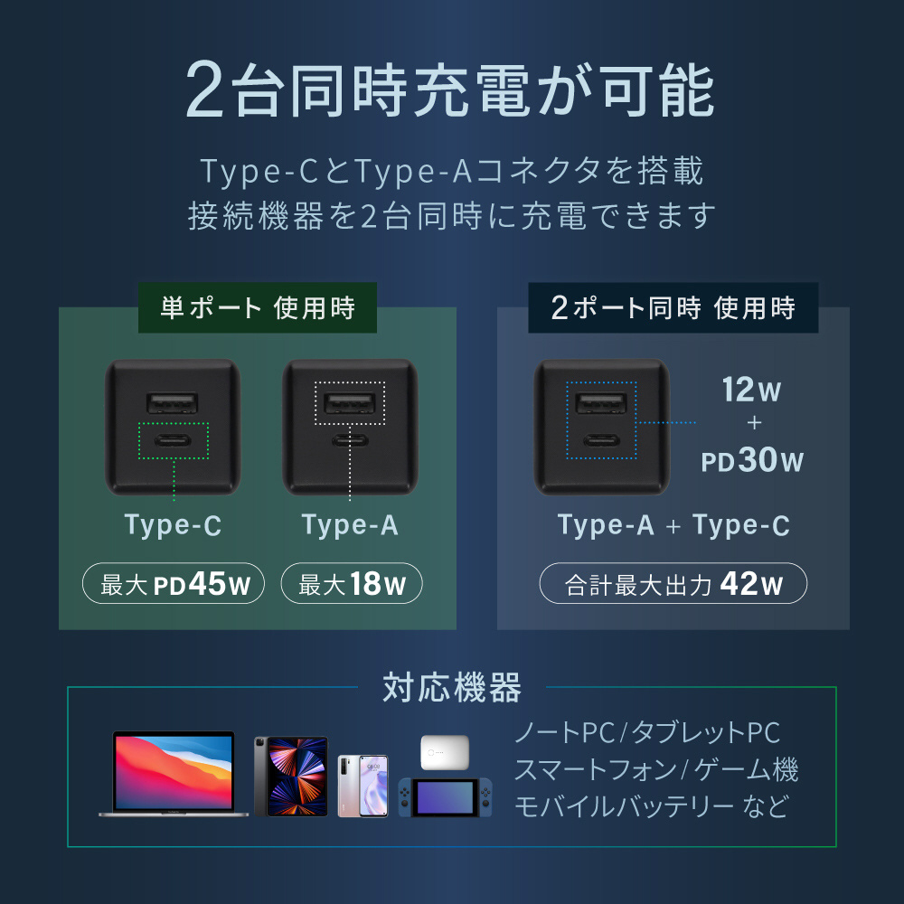 コンパクト2ポートAC充電器 最大PD45W出力 GaN(窒化ガリウム)採用 USB Type-C×1 USB Type-A×1