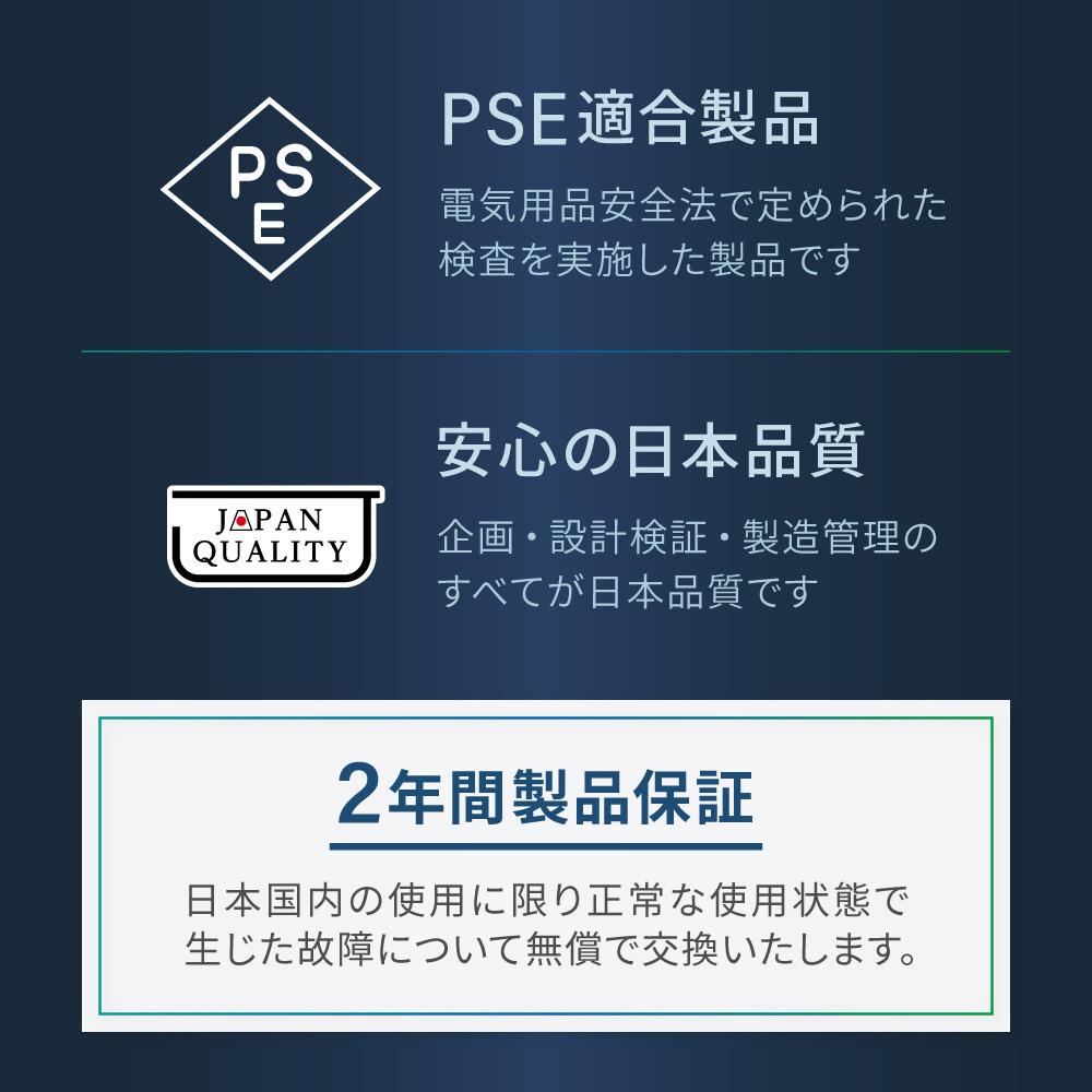 日本の法律である「電気用品安全法」で定められた検査を実施したPSE適合製品です。