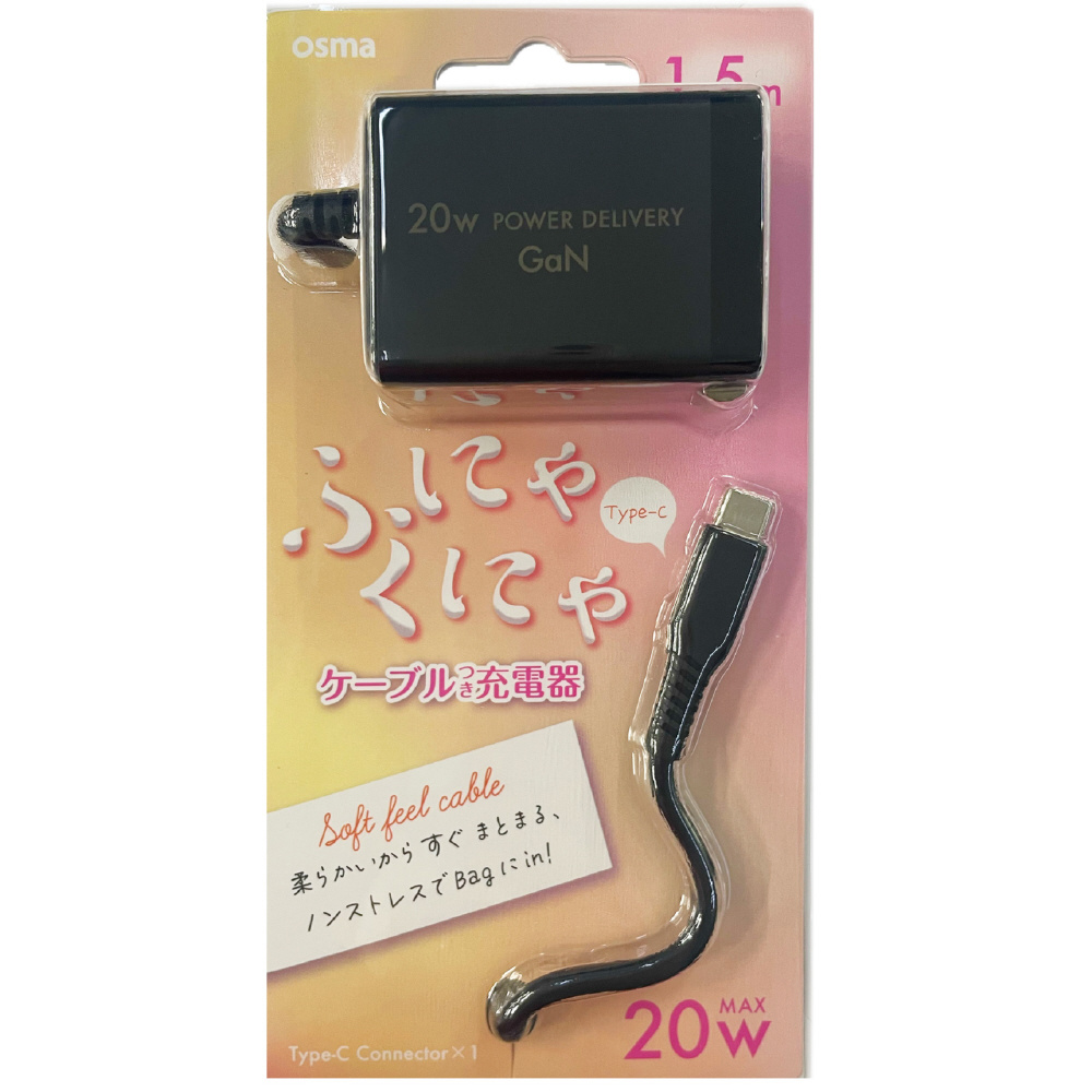 [PD20W]シリコンケーブル一体型Type-C用AC充電器 1.5m ブラック AC-C20PGSKBK [USB Power Delivery対応 /20W /GaN(窒化ガリウム) 採用]