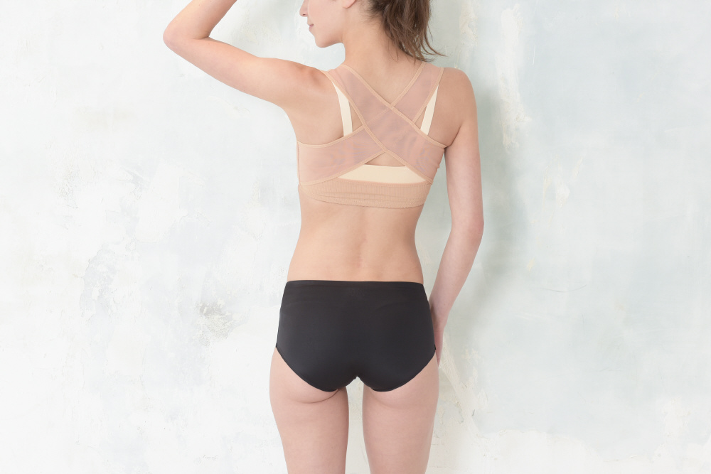 背中のクロスベルトで背筋をピッと正しい姿勢へ。 2重のパワーネットのベルトが背筋を引っ張り、 見た目の老化に繋がる猫背を若々しく補正。