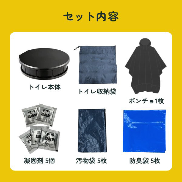 付属品 トイレ収納袋、ポンチョ、凝固剤×5、汚物入れ袋×5、防臭袋×5