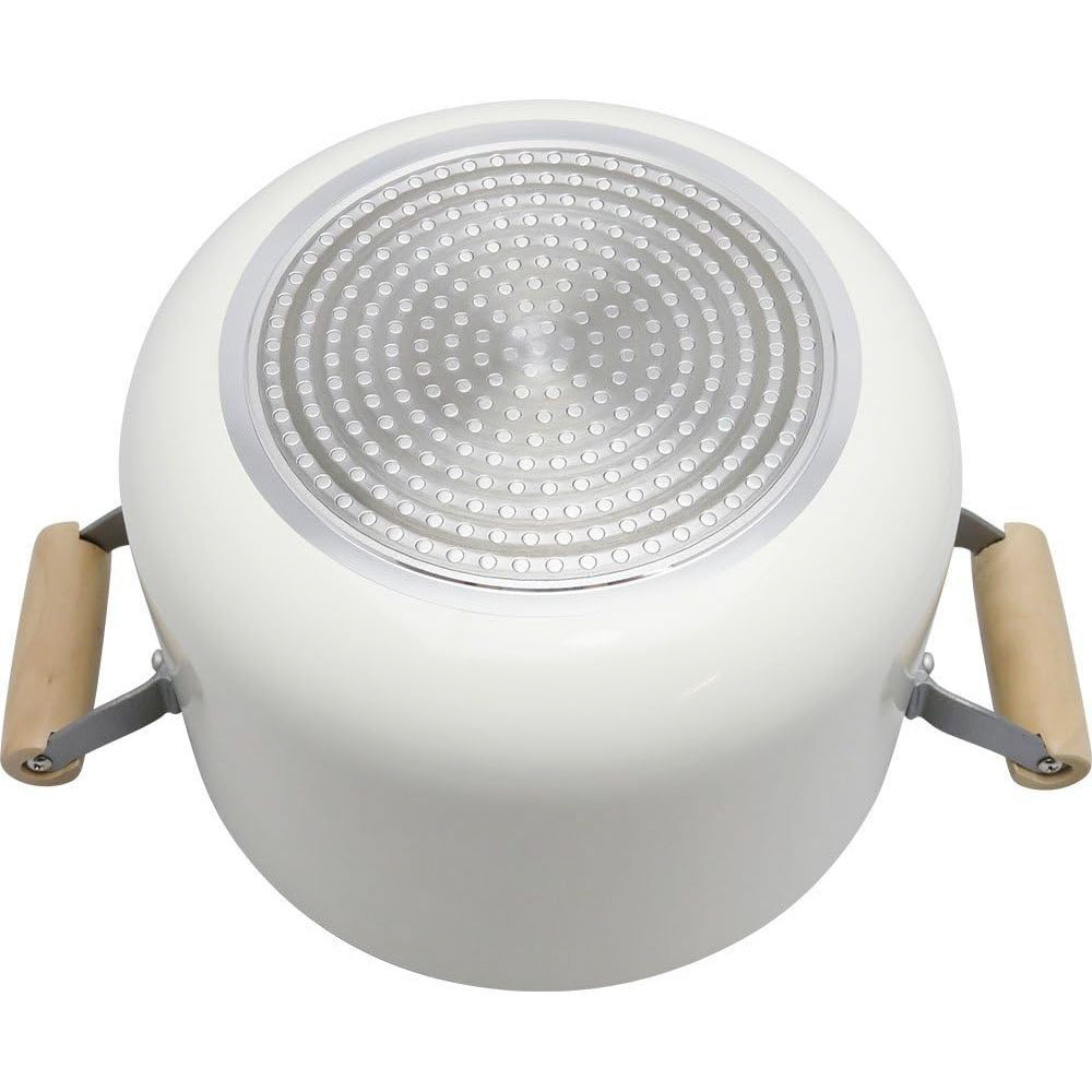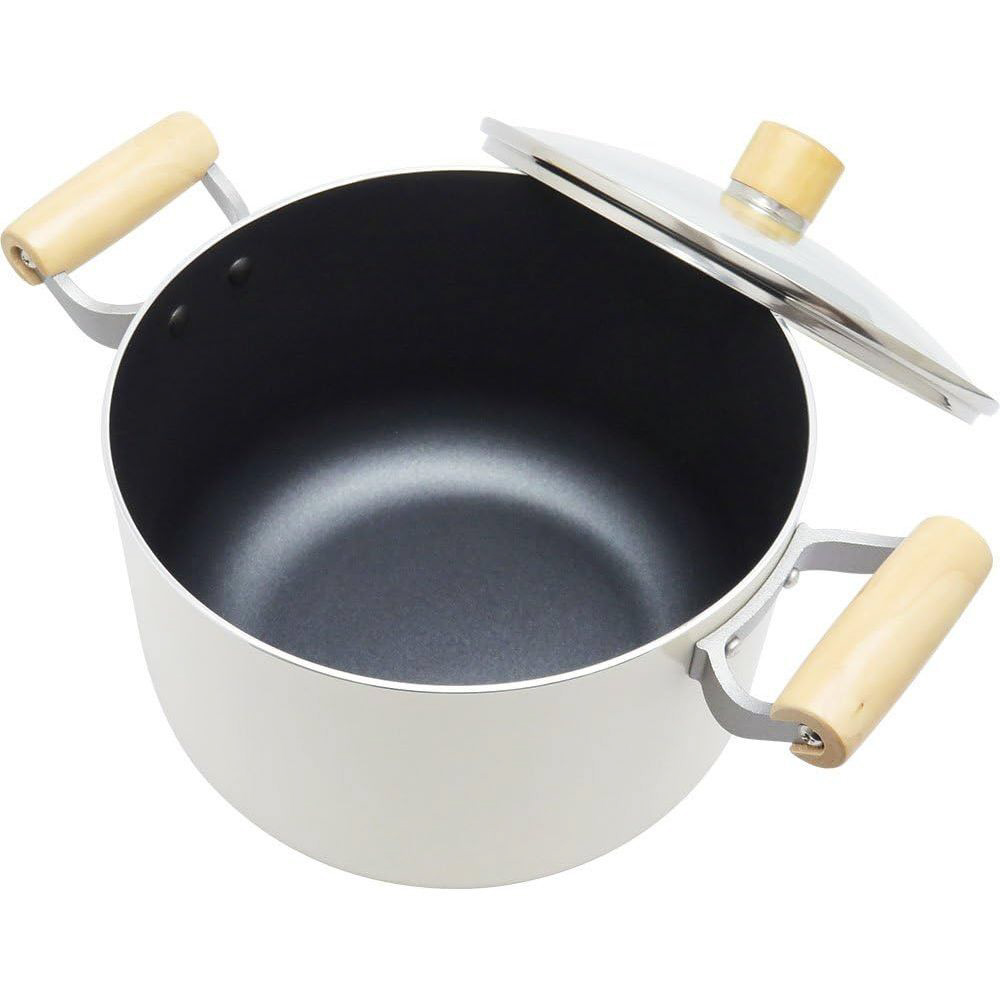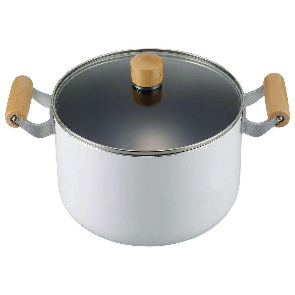 ホワイトカラーとナチュラルな木の組み合わせが、あたたかな北欧のキッチンをイメージさせます。握りやすく、熱くなりにくい木柄ハンドル。内面はこびりつきにくく、耐摩耗性に優れた3層コート「ポリゴ・エバーモイスト」特殊ふっ素樹脂加工。ガスコンロでもIHクッキングヒーターでもお使いいただけます。金属お玉が使えます(角のとがった金属製のヘラなど、鋭利な道具の使用はさけてください)。