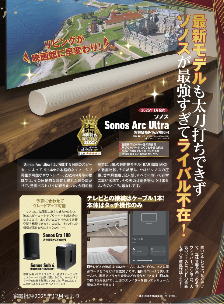 Sonosのエンジニアリングによる14のドライバーや高度なSound Motioテクノロジーを搭載した最新の音響構造を持つSonos Arc Ultraは、