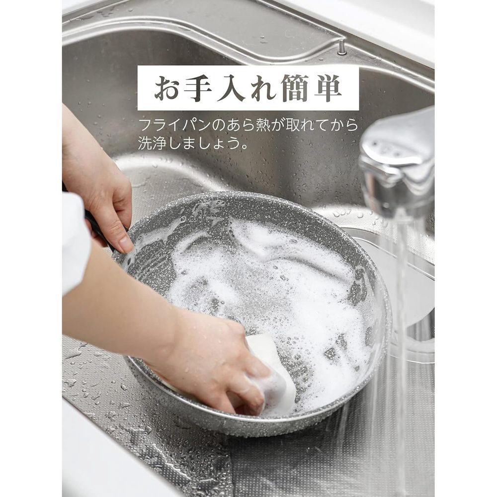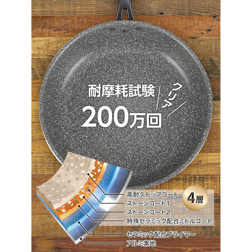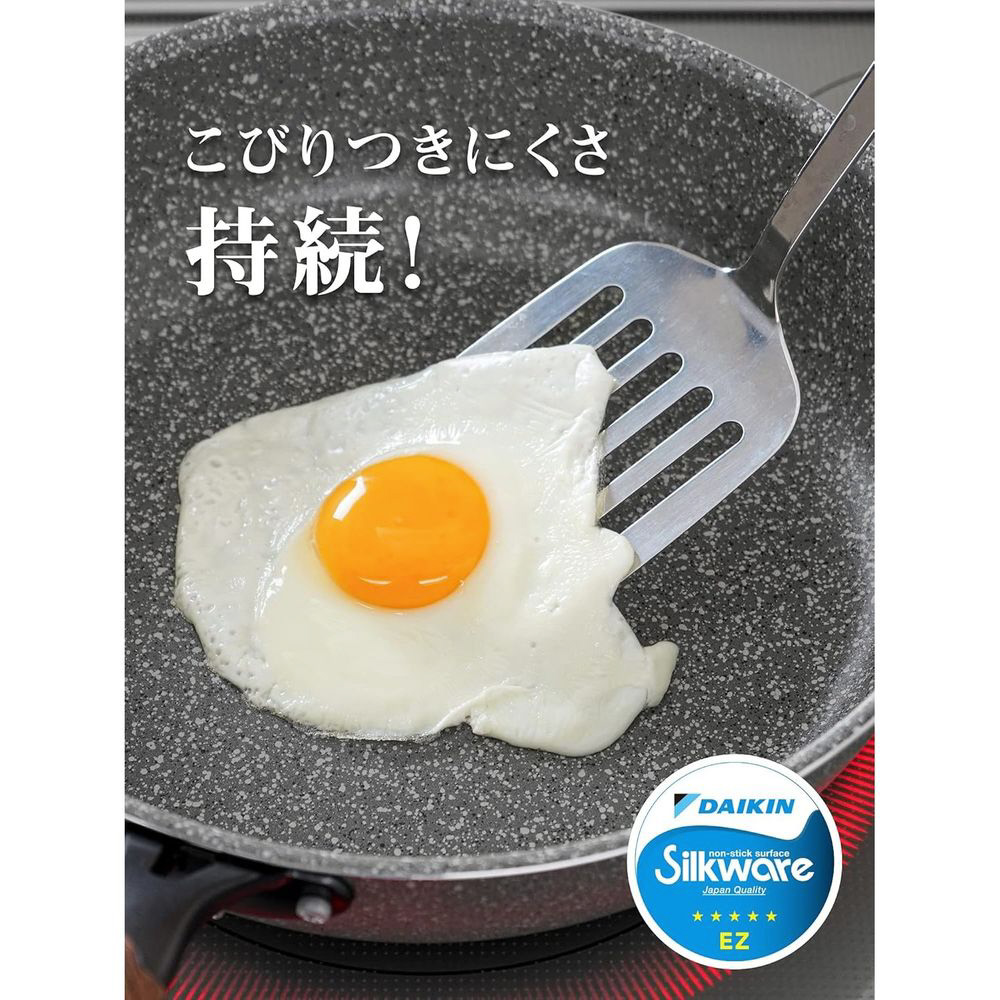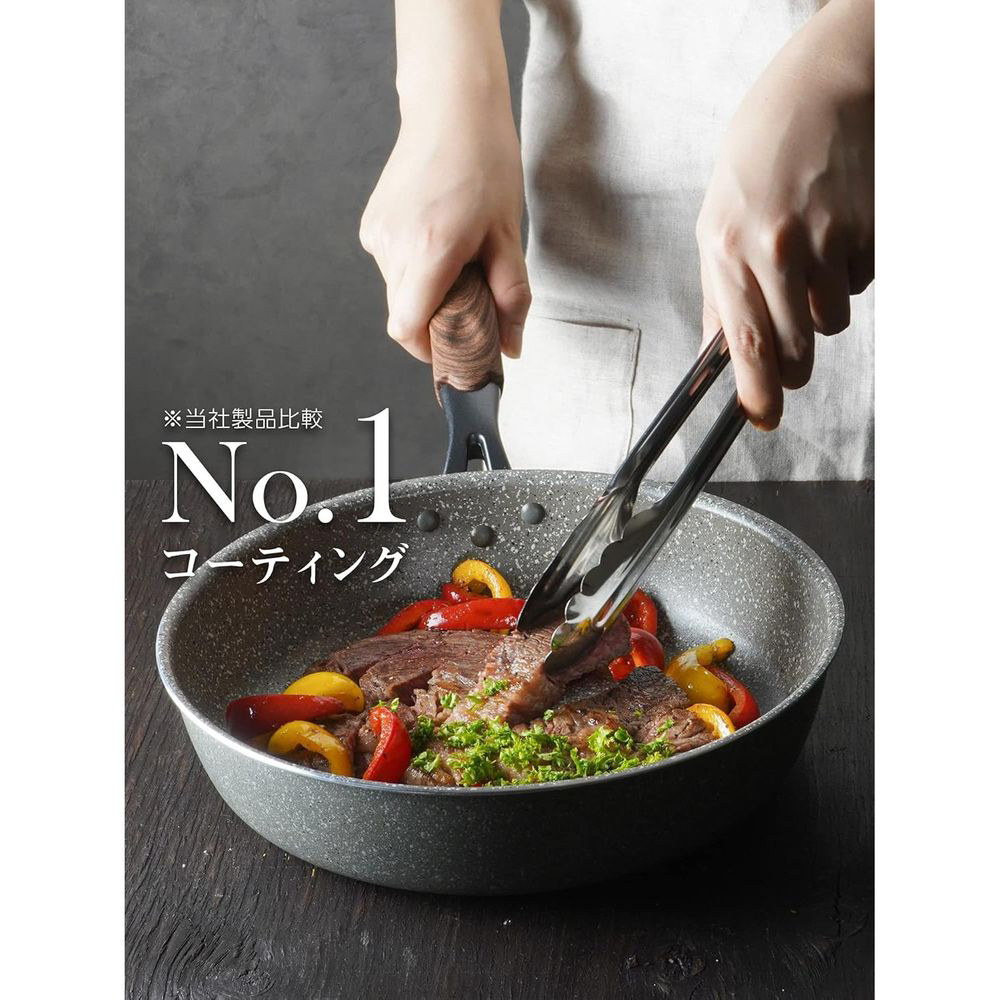 内面は特殊配合した高耐久塗膜でこびりつきにくさが持続するダイキン工業の技術に基づく「シルクウェアEZ」ストーンコーティング。金属ヘラOK(角のとがった金属製のヘラなど、特殊な道具の使用はさけてください)握りやすいシリコーンコーティングのハンドル。木目調のプリントがお洒落です。