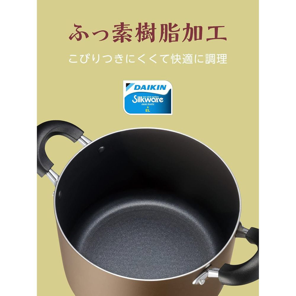 仕様3 材質:本体: アルミニウム合金、内面: ふっ素樹脂加工(シルクウェアEL)、外面: 焼付塗装、底面: ステンレス鋼、ハンドル: フェノール樹脂、蓋: 強化ガラス/フェノール樹脂