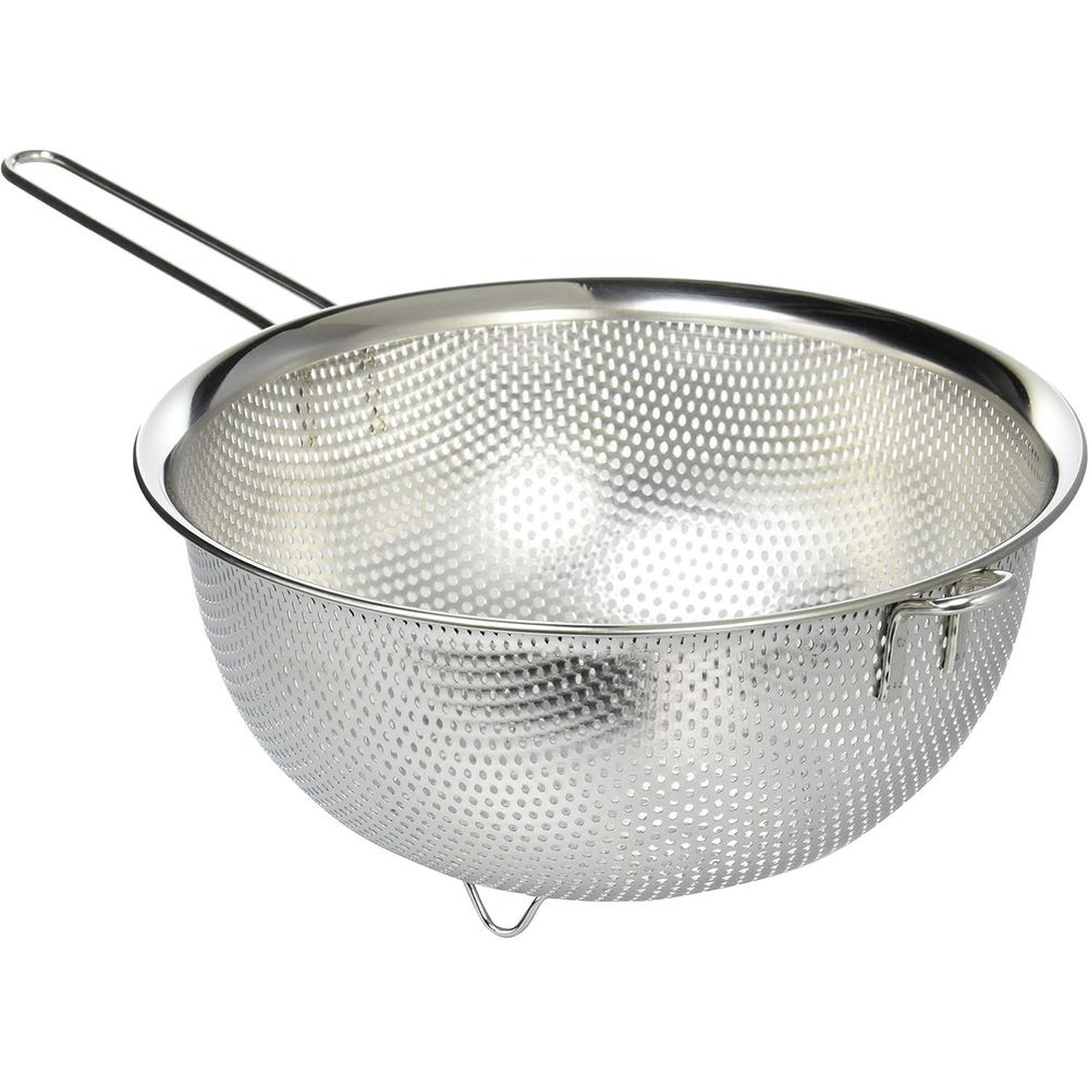 野菜、果物などの水切りや、麺類の湯切りに便利。足付きなので底部分がシンクに直接触れず、置いたまま水切りできます。ハンドル付きで麺類の湯切りや、ボウルに重ねて食材を水にさらすときに便利に使えます。