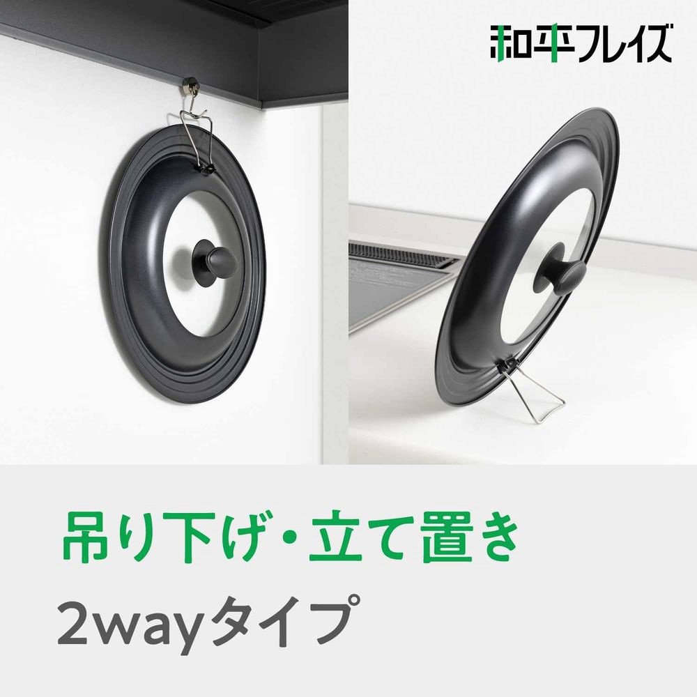 24〜28cmの鍋やフライパンに対応する軽量スタンド式調理蓋。ガラス窓付きで調理中の確認も簡単。アルミ製で軽く、汚れ落ちやすいフッ素樹脂加工。ハンドルに当たりにくい設計で、吊り下げ・立て置き両用です。