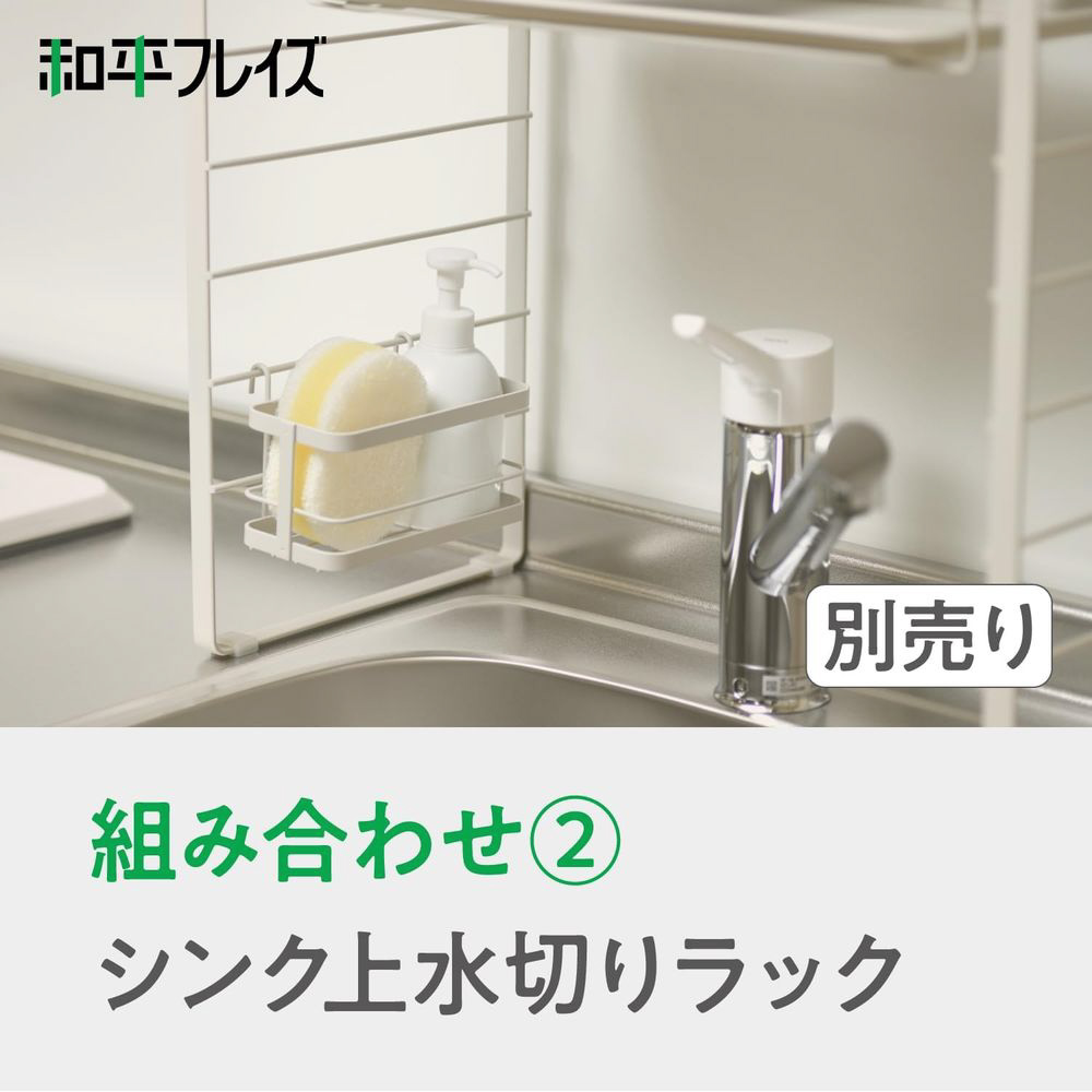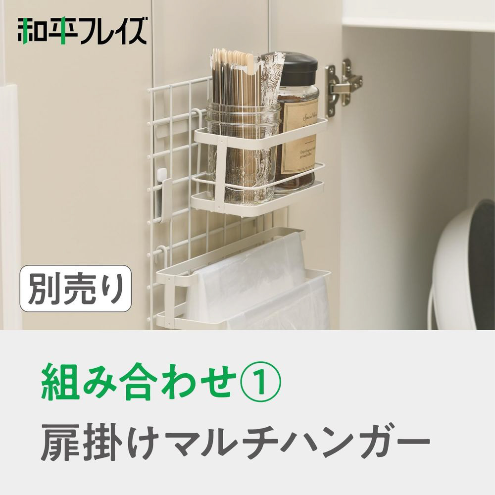 カトラリーや調味料、スポンジやラップなどを収納できるポケット。温かみのある色合いのシンプルなデザインがキッチンに馴染みます。