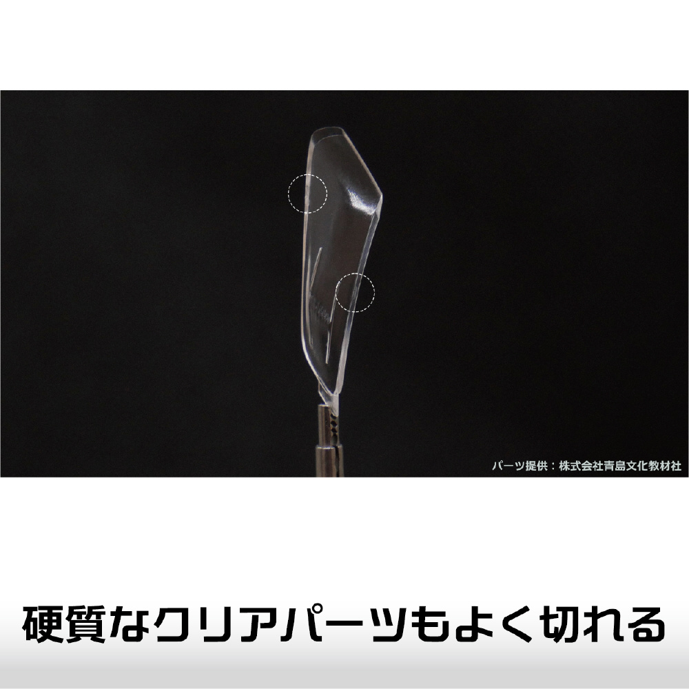 透明度が高く硬質なクリアパーツも、白化とひび割れを抑えて綺麗にカットすることができます。交換式でありながら、1枚のブレードで硬いパーツを繰り返しカットしても切れ味を長く保つのが特徴です。