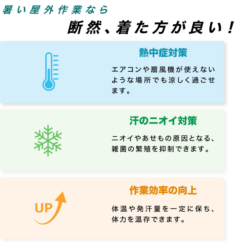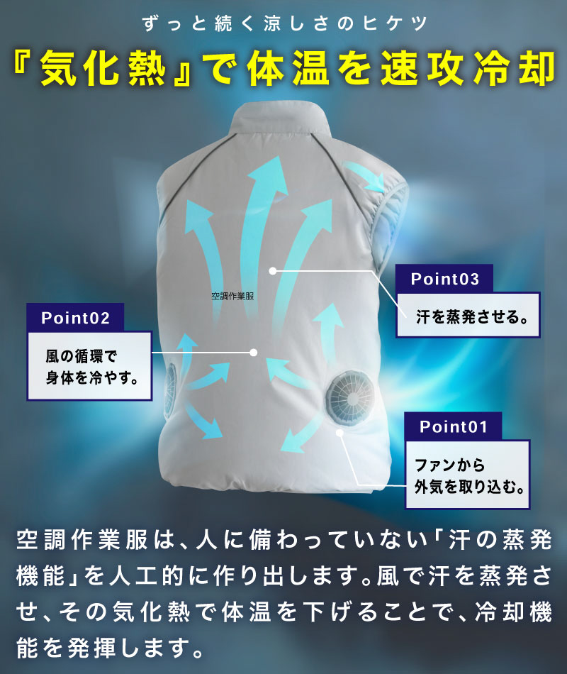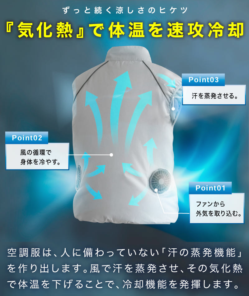 空調作業服は、人に備わっていない「汗の蒸発機能」を作り出します。風で汗を蒸発させ、その気化熱で体温を下げることで冷却機能を発揮します。