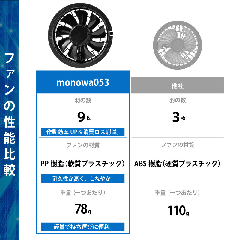 ・ファンはこだわりの9枚羽仕様。軟性のpp樹脂で耐久性が高く、しなやかに風を送ります。さらに1つ78gの軽量設計。