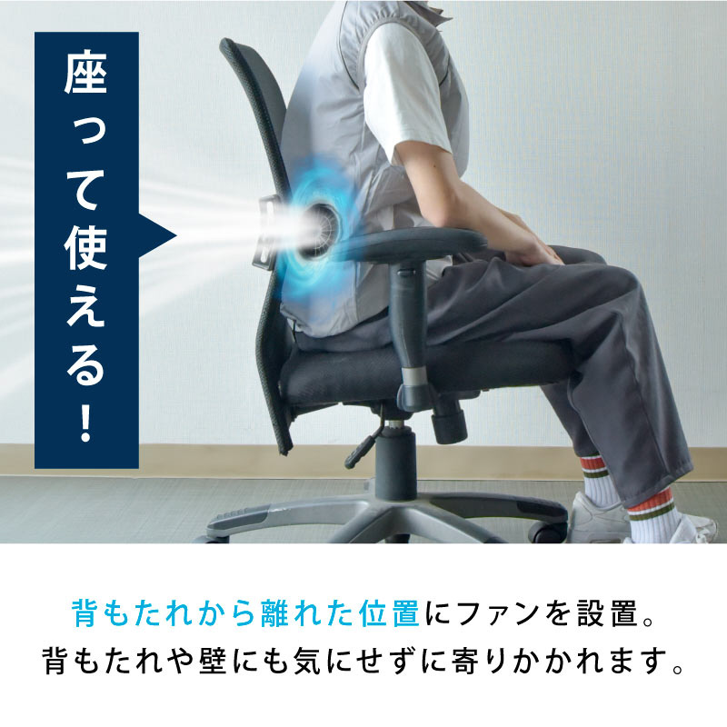 ・座って使える!背もたれから離れた位置にファンを設置。背もたれや壁にも気にせず寄りかかれます。