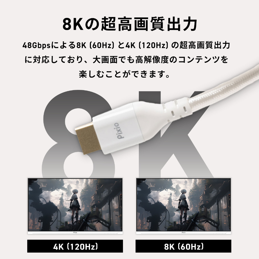 48Gbpsによる8K(60Hz)と4K(120Hz)の超高画質出力に対応しており、大画面でも高解像度のコンテンツを楽しむことができます。