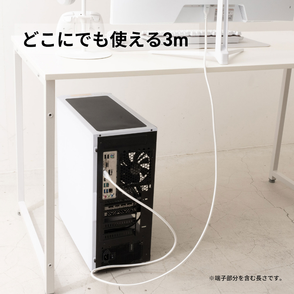 デスクの上でも下でも届く、ロングサイズの3mケーブル。