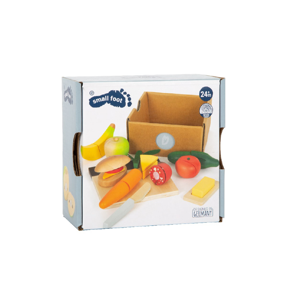 野菜、フルーツ、パンといろいろな食材が揃います。コンパクトなまな板と包丁もあり、食材を切ったり、パンにはさんでサンドイッチを作ったりとあそびが広がります。