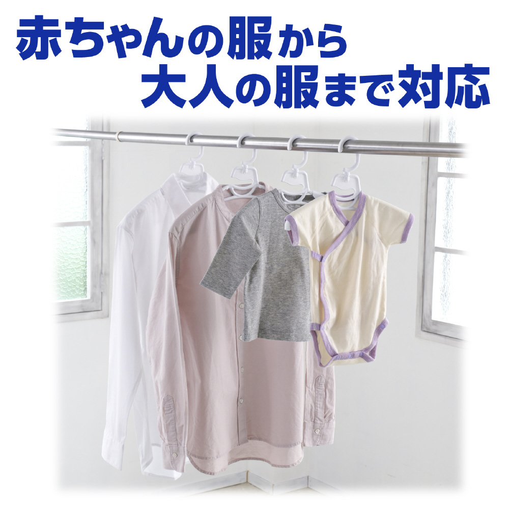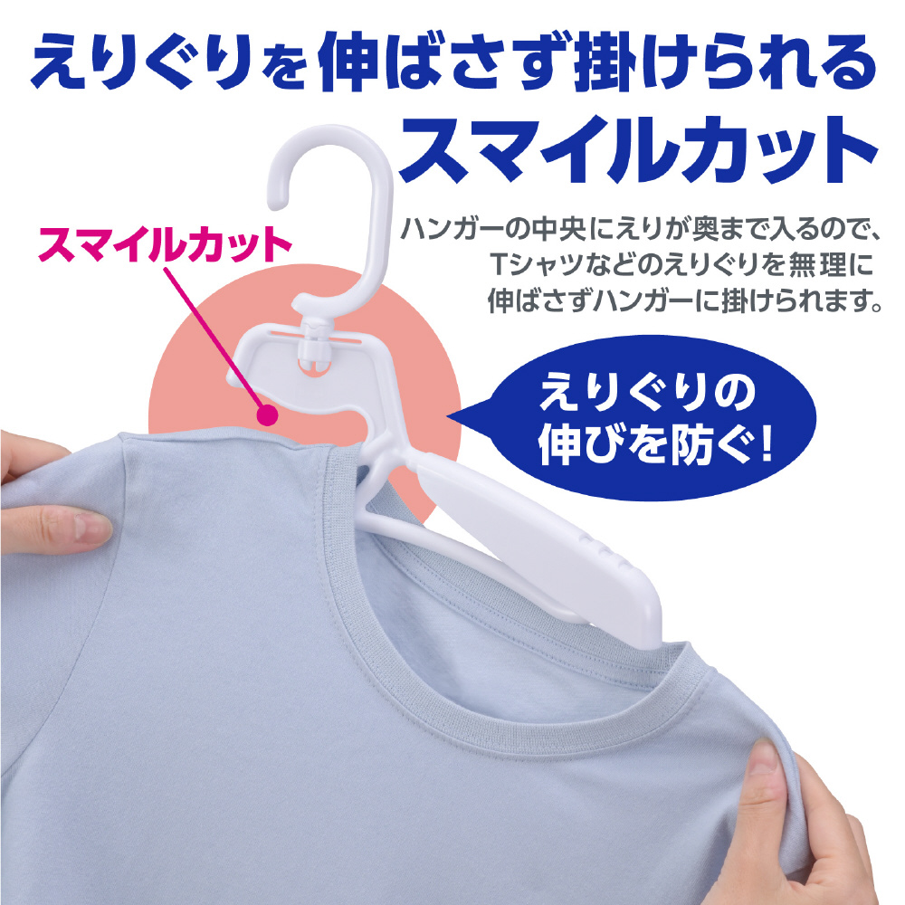 赤ちゃんから大人まで肩幅に合わせてスライド調節できるハンガー。着ているように干すことができる人体型フォルムなので、肩部分の飛び出しをおさえ、衣類を綺麗に干すことができます。肩幅に合わせて調節できるスライドショルダーで、肩幅約30cm〜41cmまでの衣類に対応できます。本体中央にはシャツのえりが奥まで入り、えりぐりを伸ばさずに掛けられるスマイルカットを設けました。