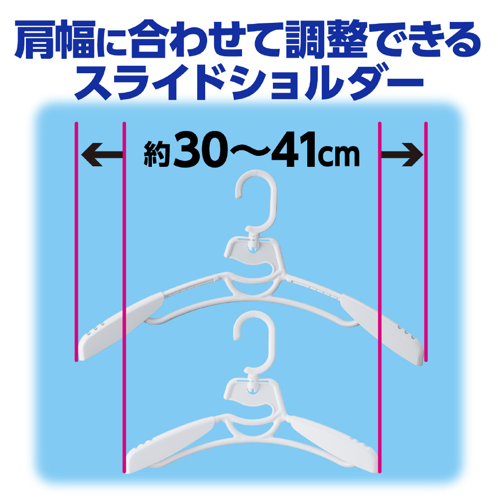 肩幅に合わせて調節できるスライドショルダーで、肩幅約30cm〜41cmまでの衣類に対応できます。