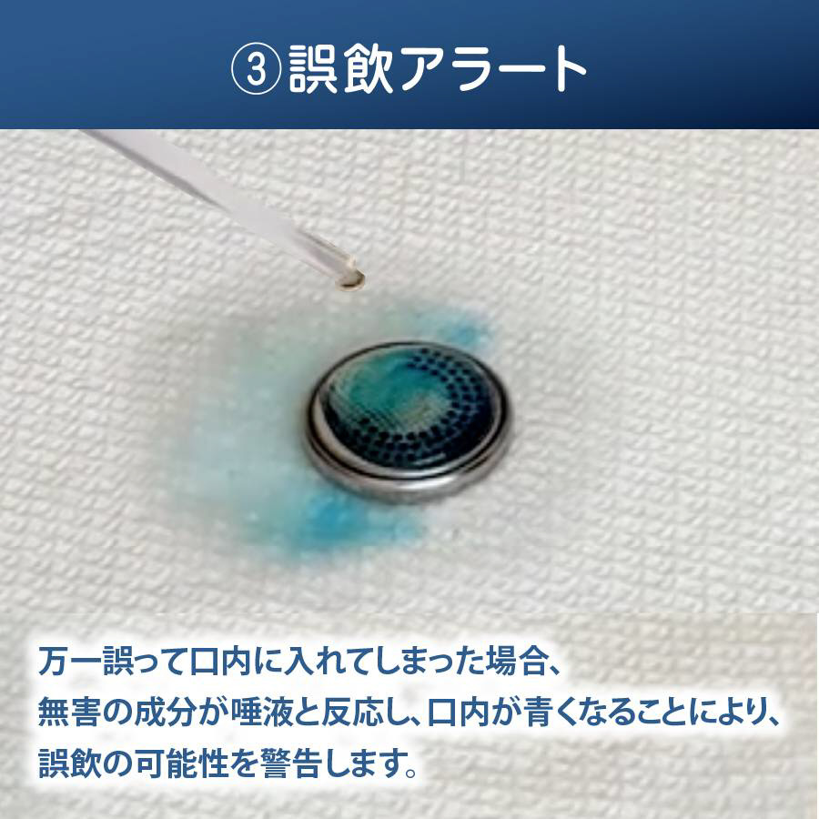 世界初 トリプルセーフティシステム。電池の誤飲リスクを低減させ、万が一の誤飲の可能性をカラーで警告します。