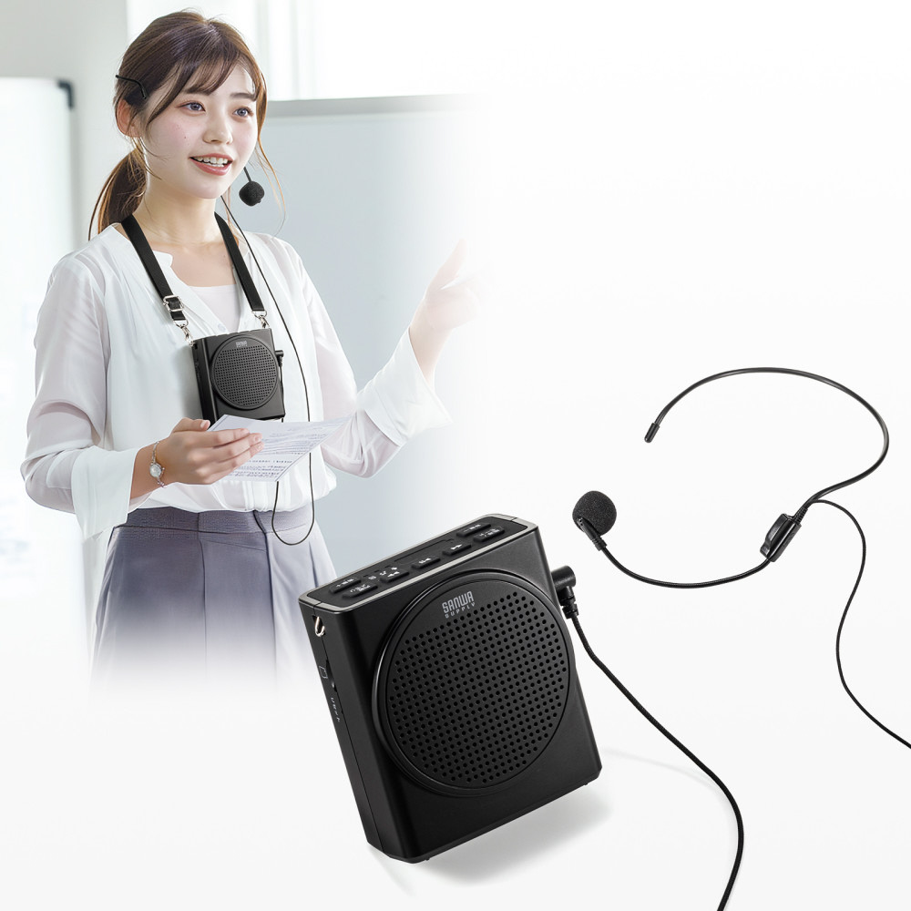 従来品よりも出力アップした最大13Wのポータブル拡声器スピーカー。ハンズフリーで説明をしながらの拡声案内に最適。
