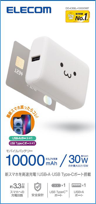 高出力30Wがポケットに収まる!USB Power Delivery 30Wでスマートフォンやタブレット・ノートパソコン・ゲームなどを充電できるモバイルバッテリーです。1日外出する際にも安心して使える10000mAhです。かわいいしろちゃんモデルです。