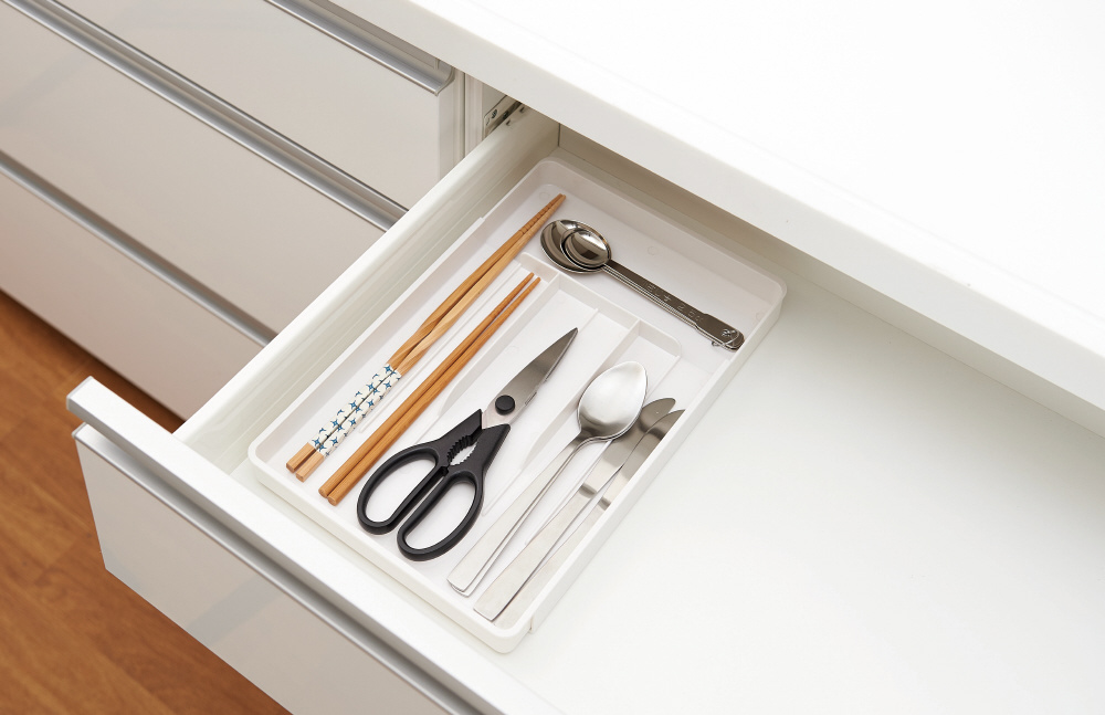 引き出しの奥行に合わせてサイズを調整でき、長い菜箸やキッチンばさみも収納できます。