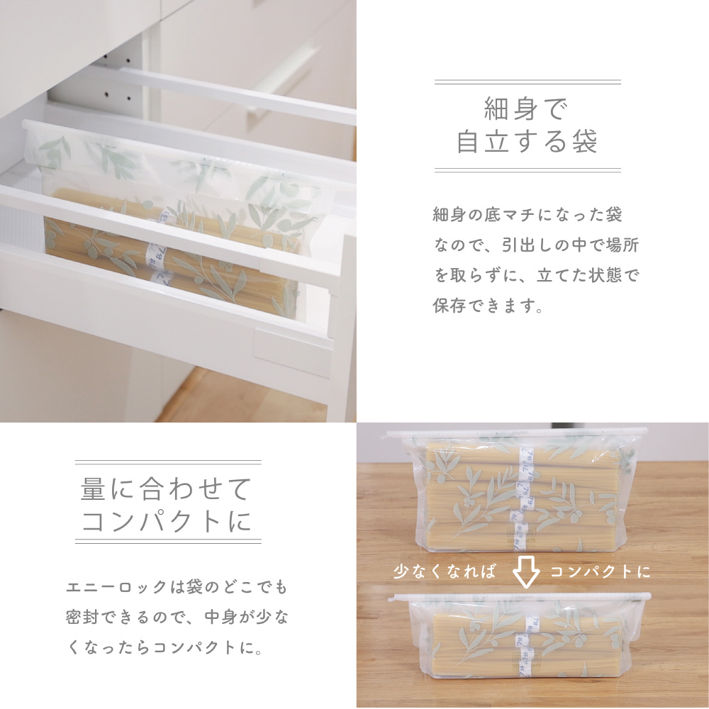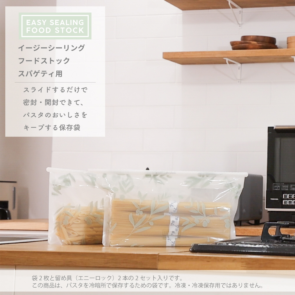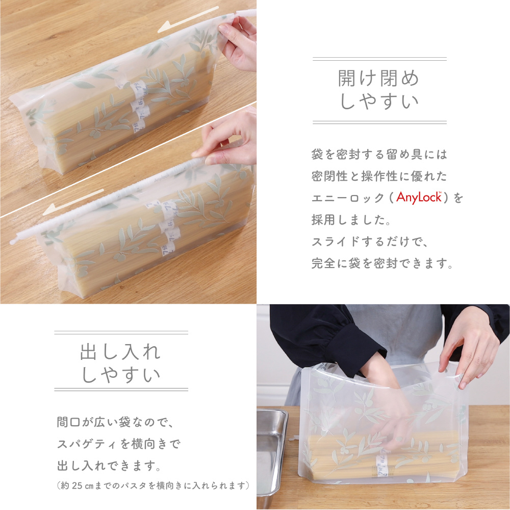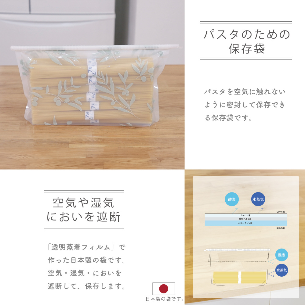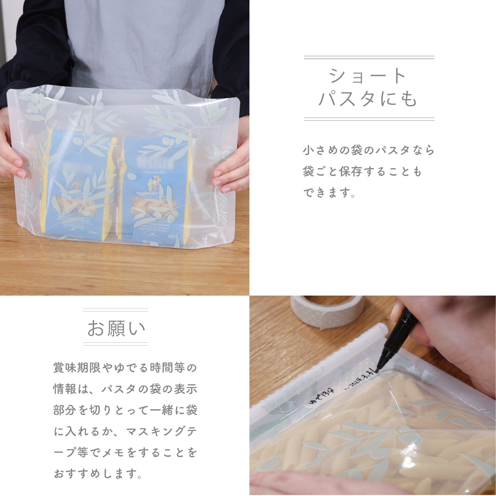 パスタをおいしい状態に保つ保存袋。ロングパスタやショートパスタの保存用です。