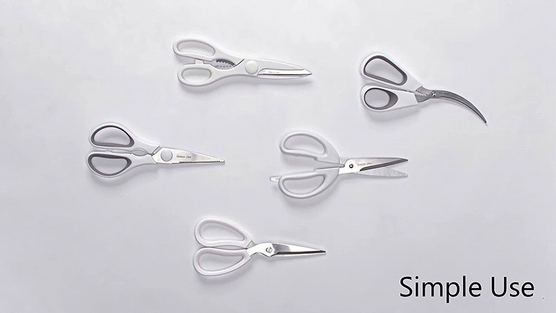 「Simple Use」Simple life with Simple Use.ニーズは変わる。シンプルなデザインで応える。清潔感のあるホワイトを基調としたシンプルなデザインで、統一感のあるキッチンに。パール金属から新しい「Simple Use」シリーズが誕生しました。長いギザカーブ刃で、食材を逃がしにくいカーブはさみ。皮やスジのある肉、イカやタコなどのカットにも。カーブしているので、お皿の上でも切りやすく食材の下ごしらえに最適です。
