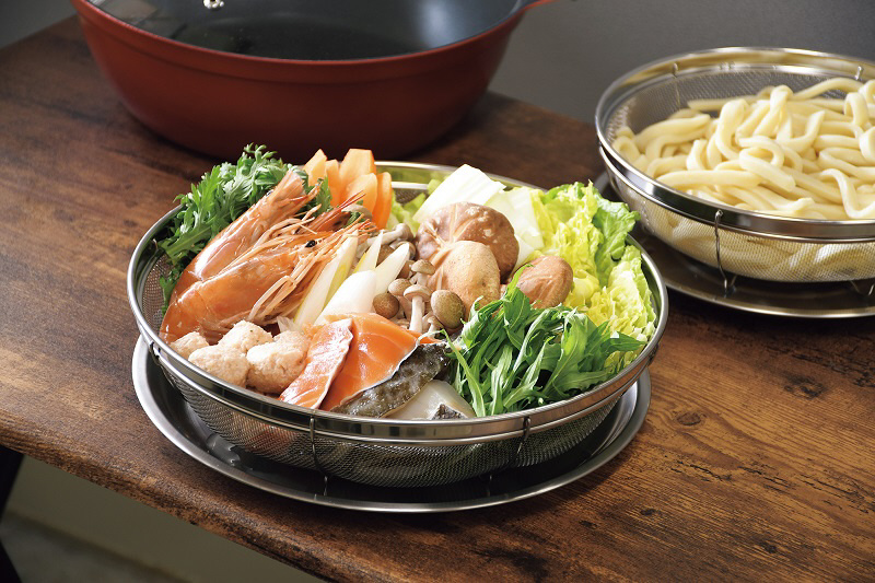 水切りしながらそのまま食卓へ鍋の具材の盛り付けにザルは傷切れが良く足付だから衛生的ザルのアミは強く押さないでください。