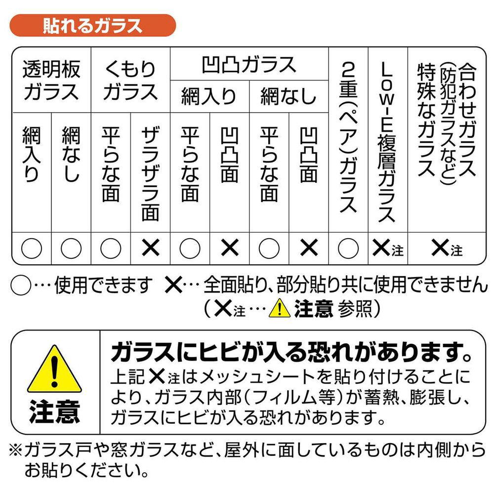 ・注意事項:使用できるガラス 透明板ガラス、くもりガラスの平らな面、凹凸ガラスの平らな面、2重(ペア) ガラス 使用できないガラス 合わせガラス、複層ガラス、凹凸・ザラザラしたガラス面