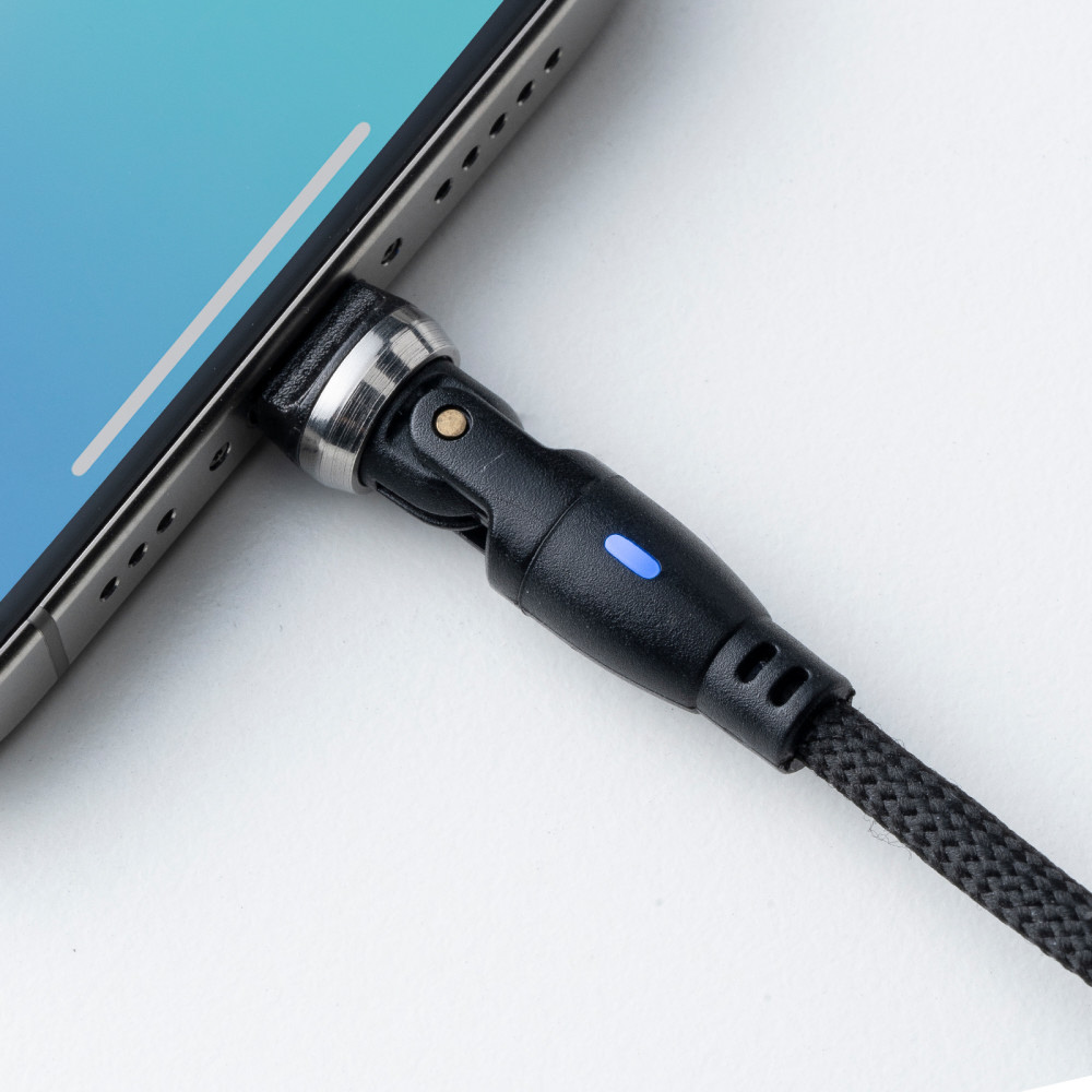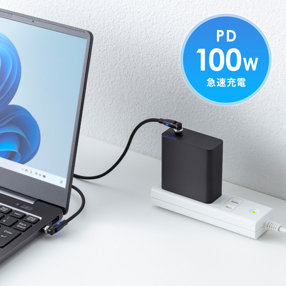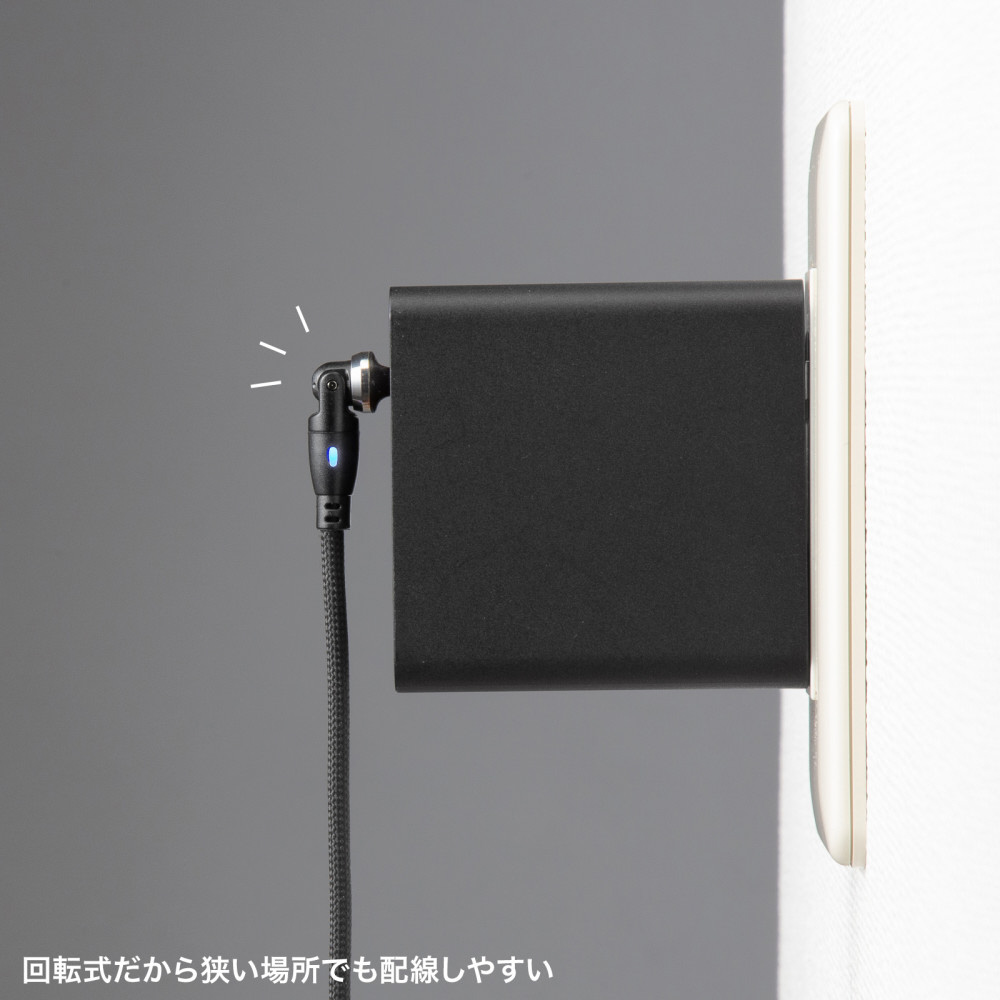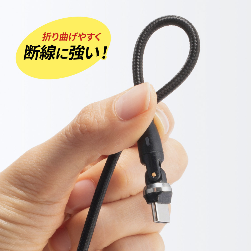 両端のコネクタが540度(左右180度+水平360度)自由自在に回転。操作性と耐久性を大幅に向上させたUSB Type-Cケーブル。PD100W対応。