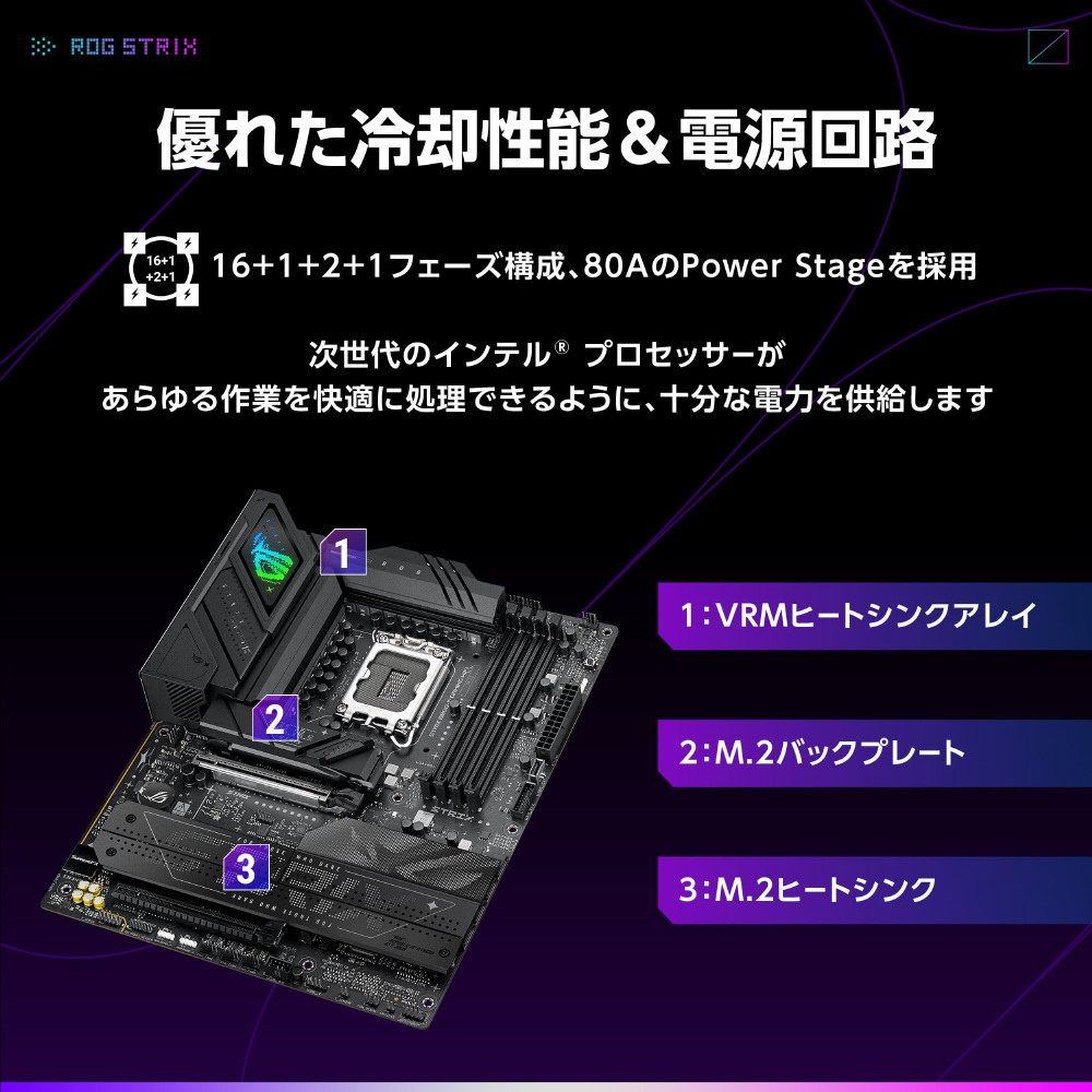 VRM ヒートシンクアレイ、ヒートシンク付きM.2スロット、M.2 バックプレート