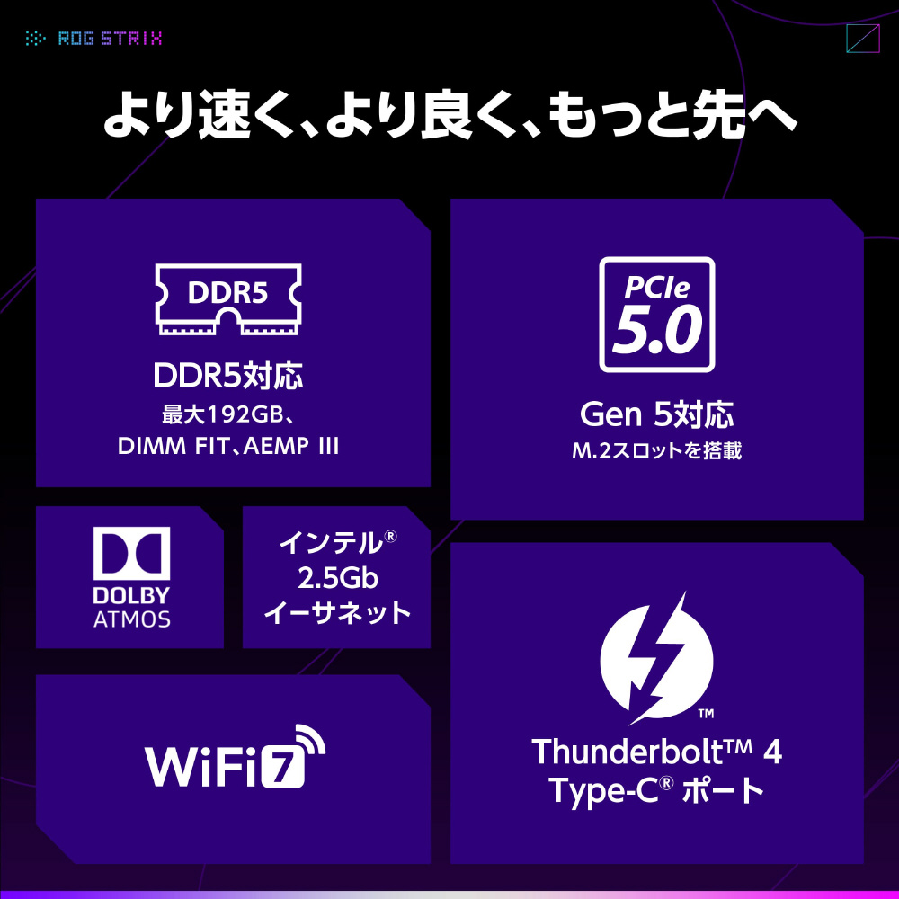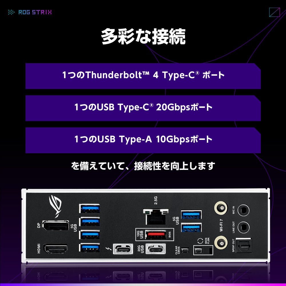 1 × M.2 Gen5、Thunderbolt 4、USB 20Gbps Type-C、フロント10Gbps Type-C、PCIe 5.0 x16 SafeSlot