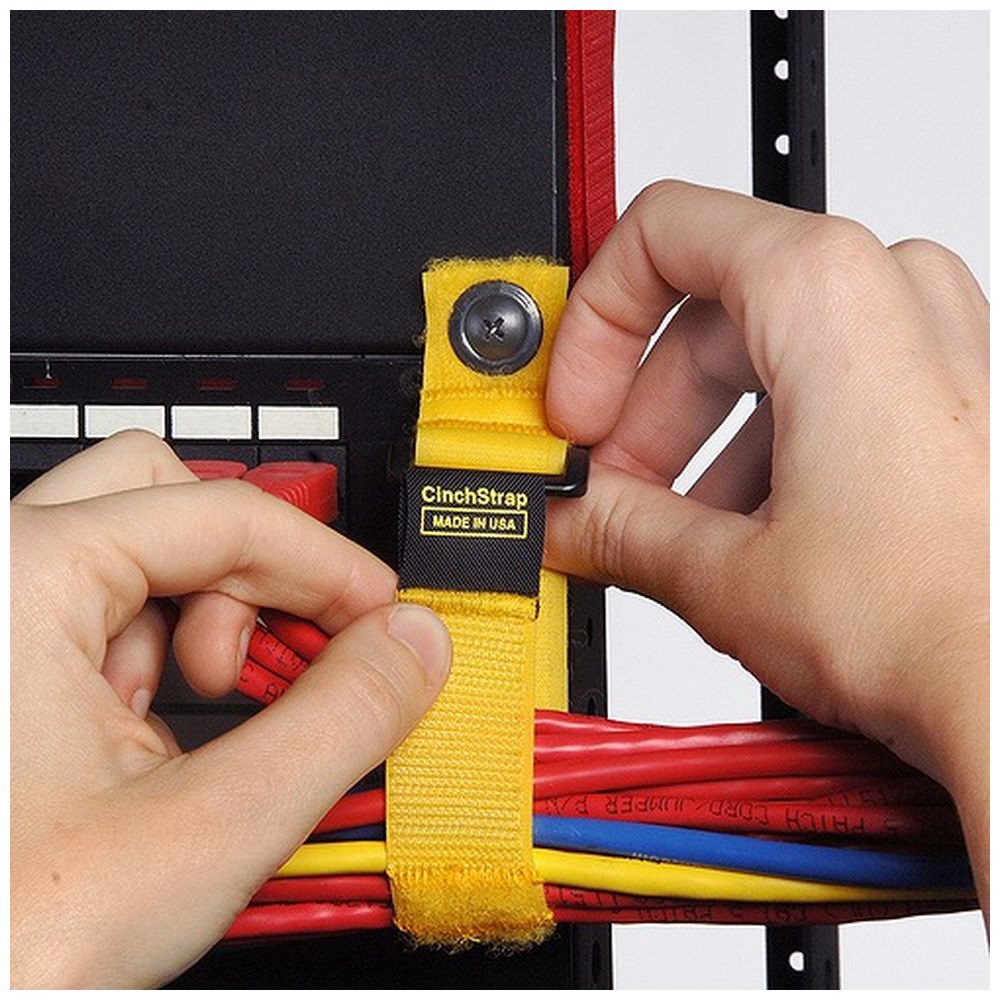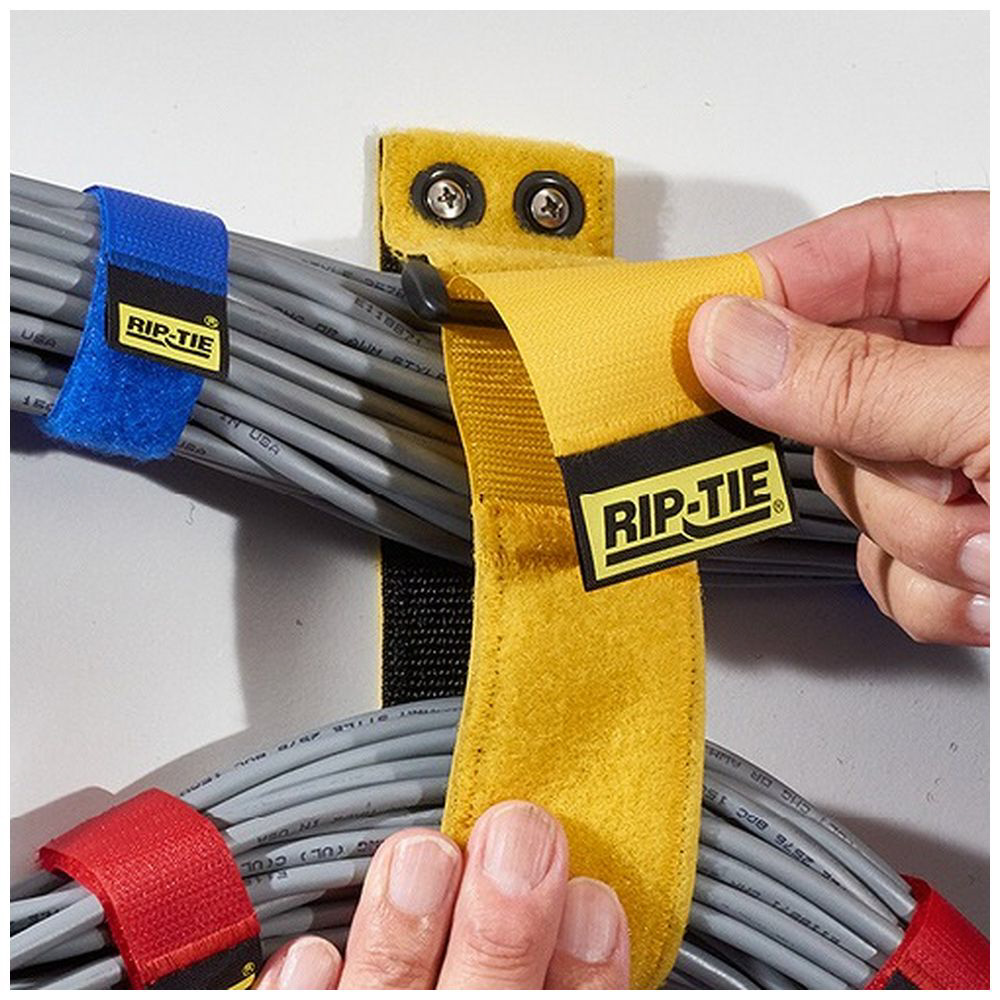 壁やラックにネジで固定して使えるハトメ穴付きケーブルラップ。裏面に「工業用ナイロンウェビング」を縫い合わせて補強した重負荷向け。重量のあるケーブルもしっかり支えます。