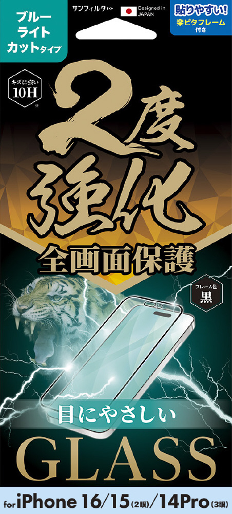 iPhone 16/15/14 Pro 2度強化ガラス(フレーム) ブルーライトカット i38FGLBLF