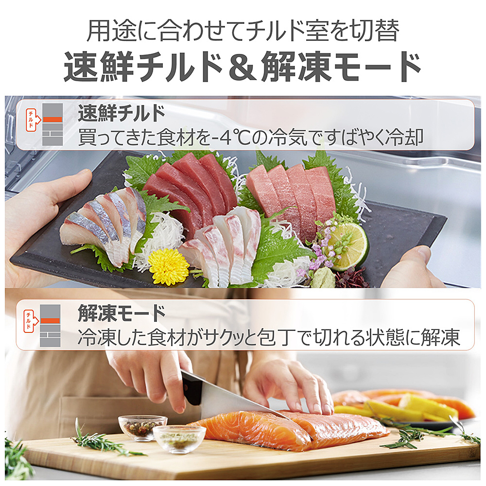 「野菜長期保存で新鮮な毎日」スマート大容量タイプのベジータ。対面キッチンでも広々感じる薄型構造。