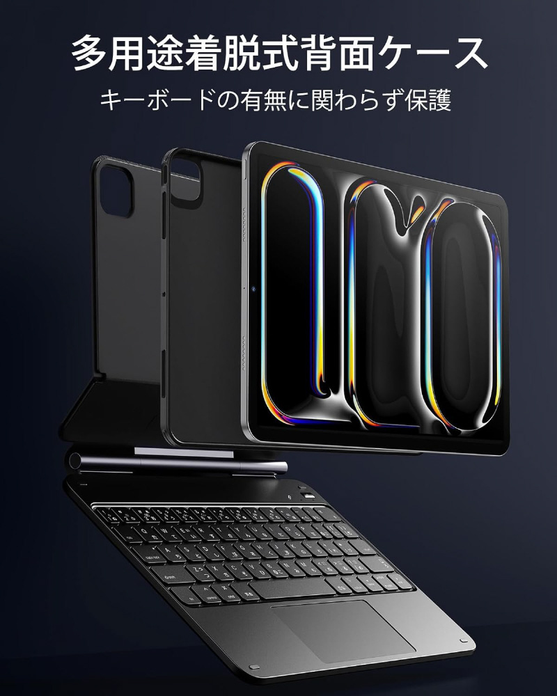 11インチiPad Pro(M5/M4)用 縦横モード対応 着脱可能 保護ケース付きキーボードケース ESR Rebound Magnetic Keyboard Case 360 iPad Pro 11 M4 チャコールグレー