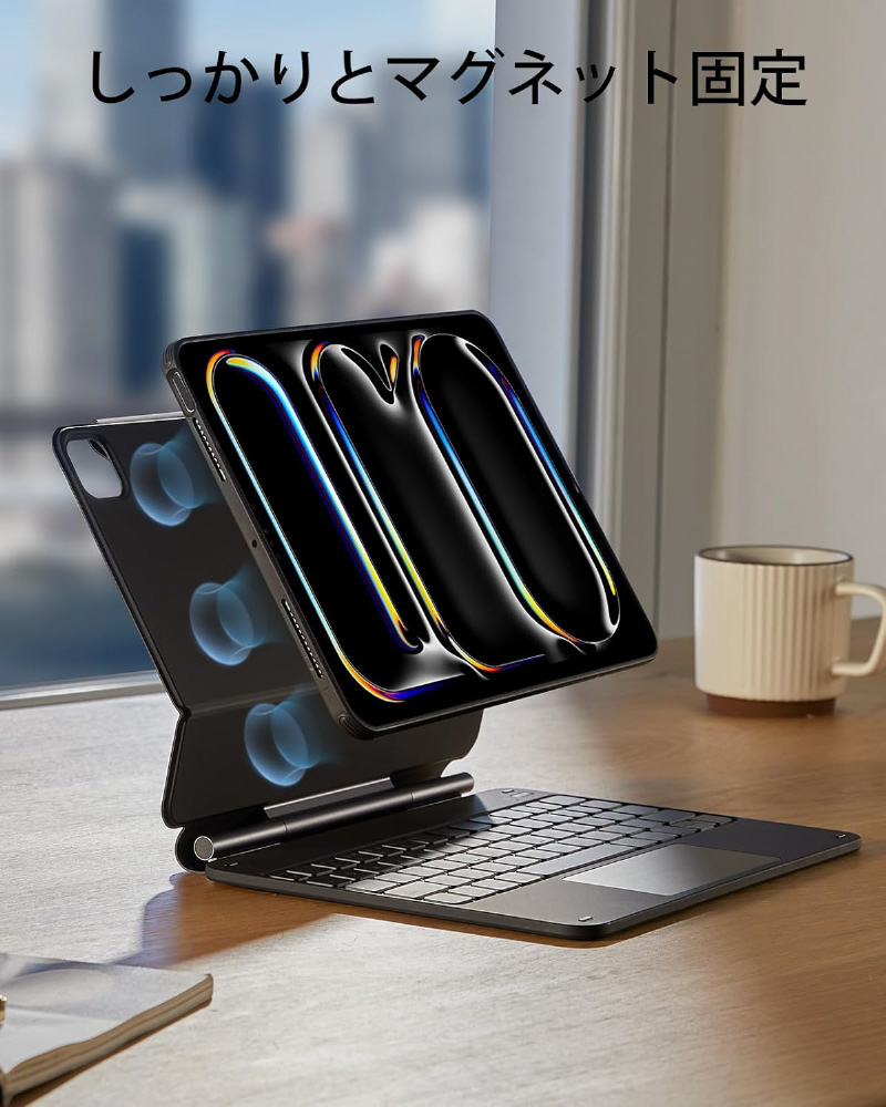 超強力マグネットがケースとタブレットをシームレスに結合し、タイピングや閲覧に最適な角度にフローティングカンチレバースタンドを簡単に開けます。