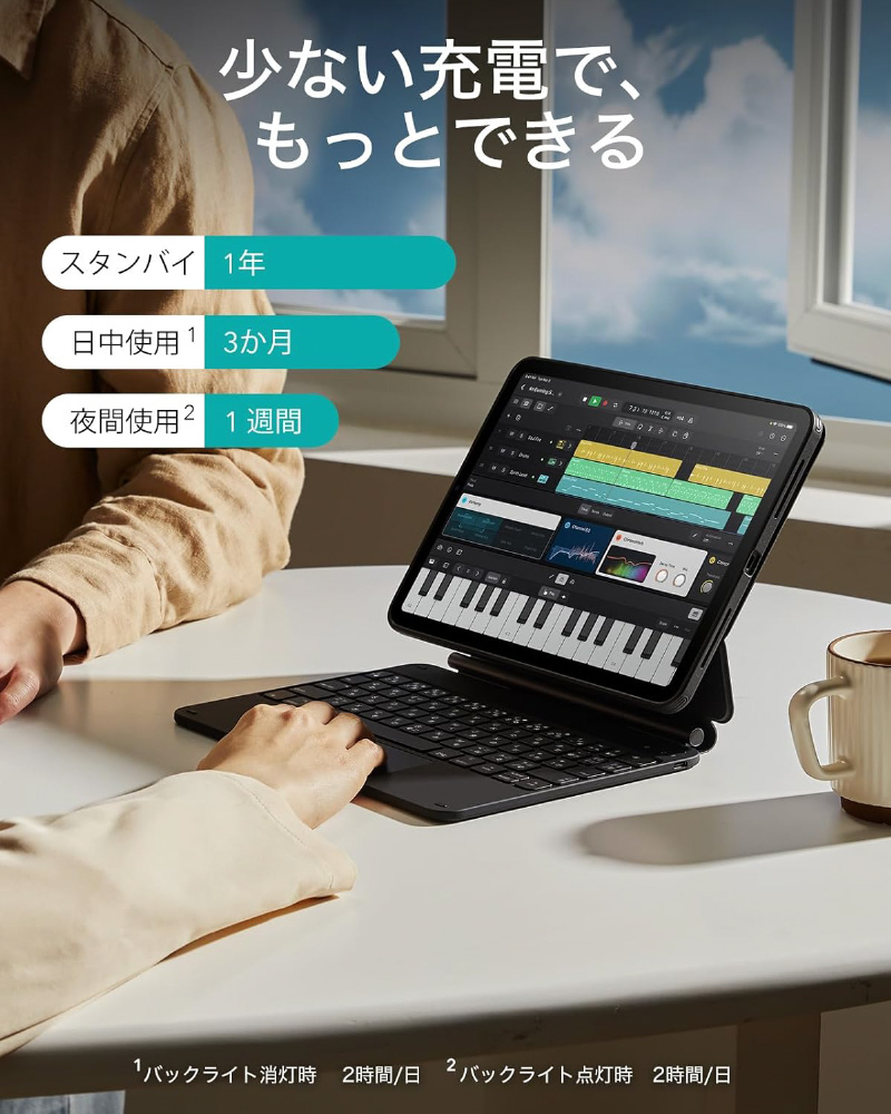 背面ケースにより全面保護ができ、また即座に取り外してタブレット単独で使用可能で、より良い姿勢で使用できるレイズドスクリーンモードと、FaceTimeに最適な横向きモードを楽しめます。