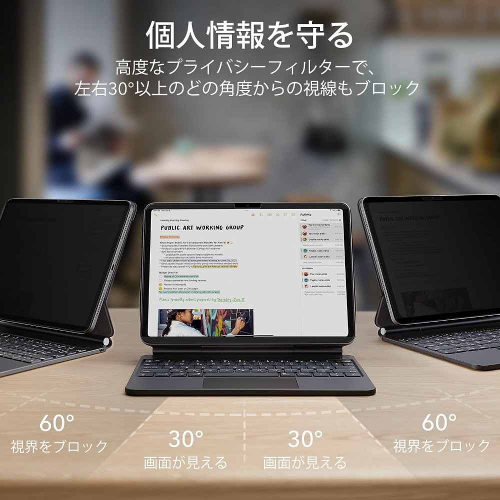 画面のプライバシーを保護したい時は磁気フレームでiPad画面にワンタッチで取り付けられ、使用後は簡単に取り外して、元の画面が楽しめます。
