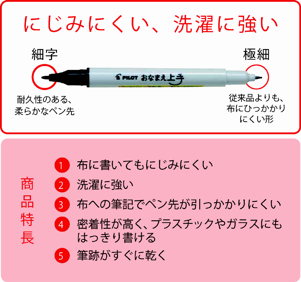 布へもにじまずキレイに書ける。プラスチックやガラスにもはっきり書ける。親子のための新定番名前ペン。キッチンで保存袋やラップへの筆記にも最適!