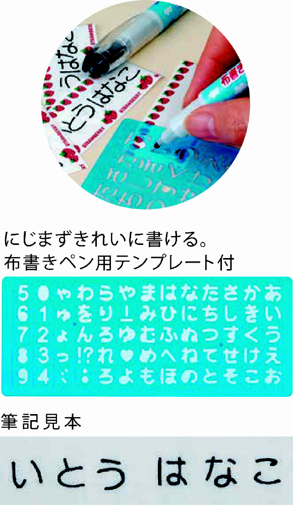 布へもにじまずキレイに書ける。プラスチックやガラスにもはっきり書ける。新定番名前ペン「おなまえ上手」と、にじみにくく洗濯に強い「布書きペン」に、布書きペン用ミニテンプレートが付いたセットです。にじみにくく、なめらかに、キレイな文字で名前書き。