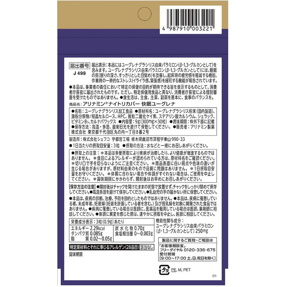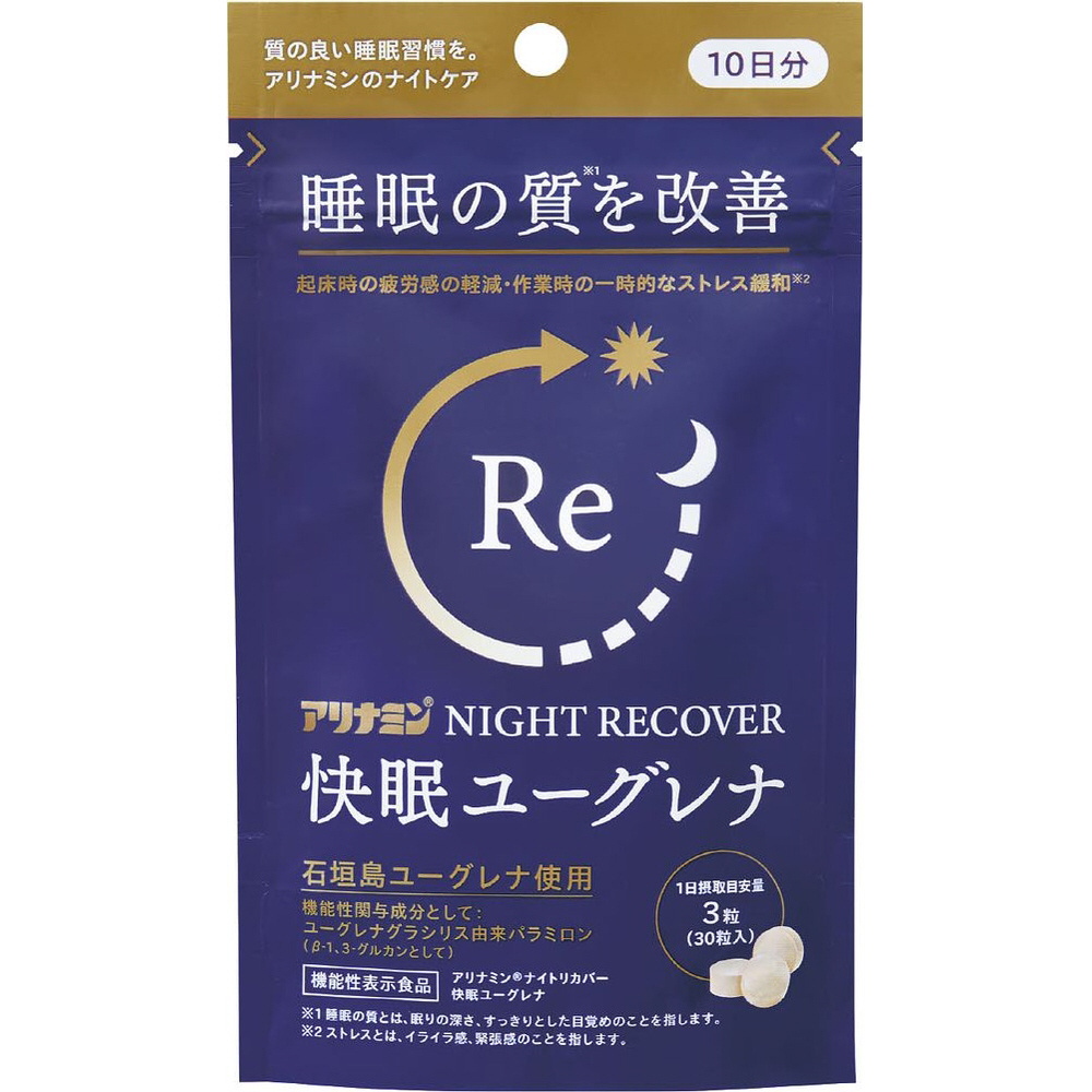 ● 機能性表示 ユーグレナグラシリス由来パラミロン(β-1,3-グルカンとして)には、睡眠の質(眠りの深さ、すっきりとした目覚め)を改善し、起床時の疲労感を軽減する機能、作業時の一時的なストレス(イライラ感、緊張感)を緩和する機能が報告されています。