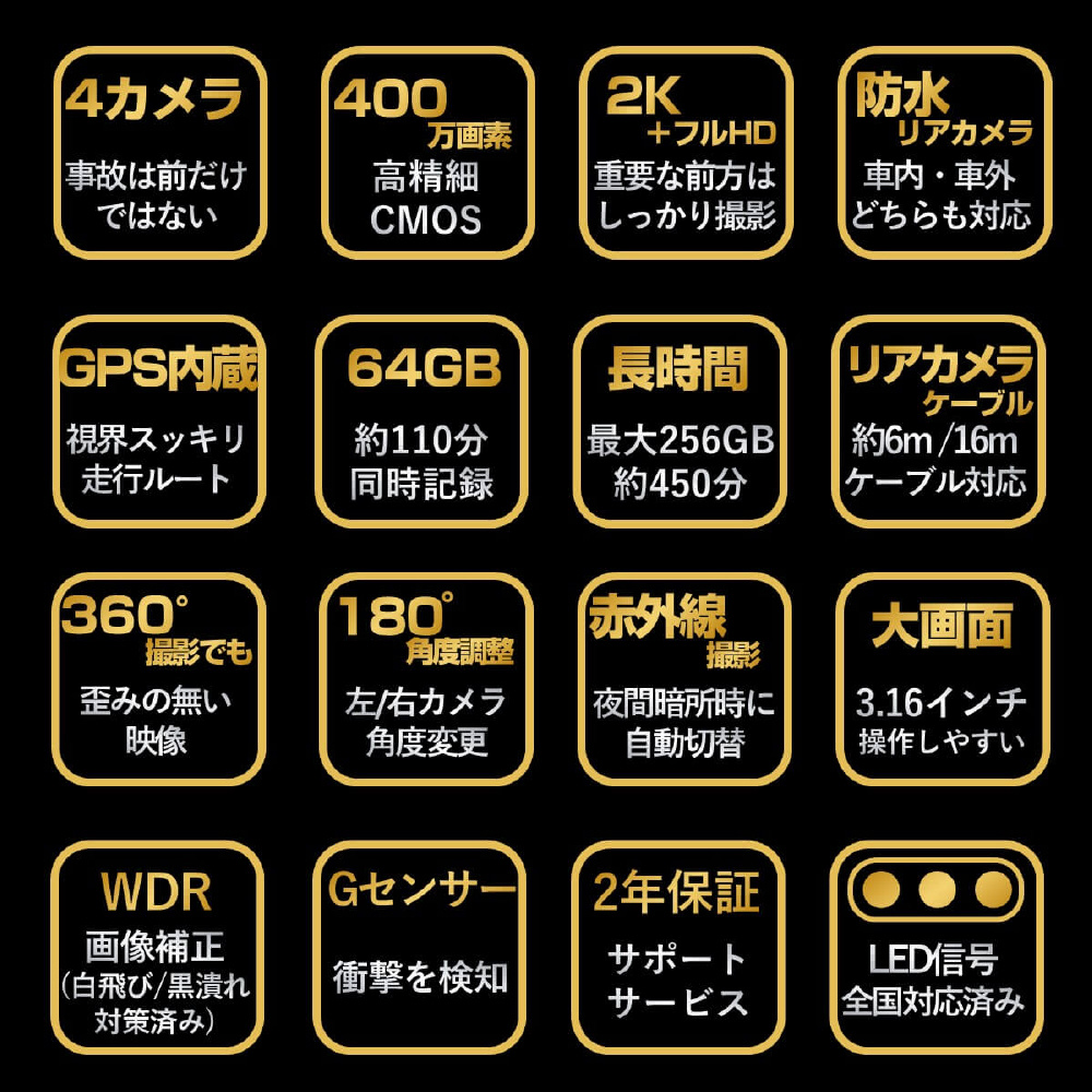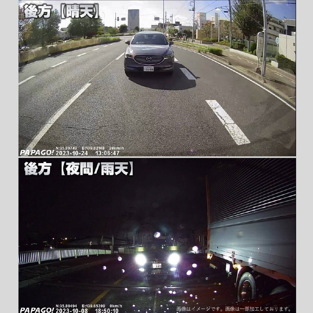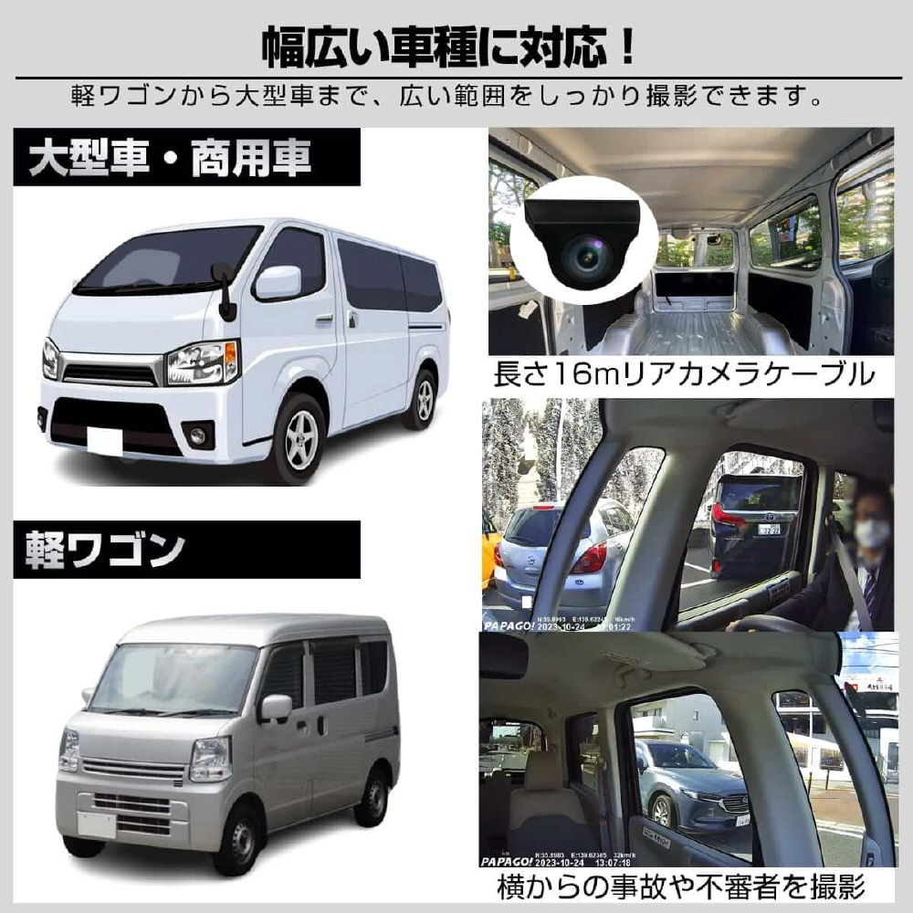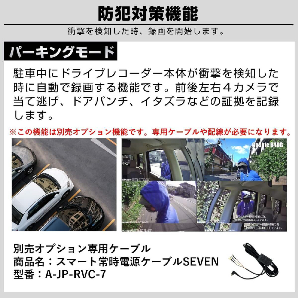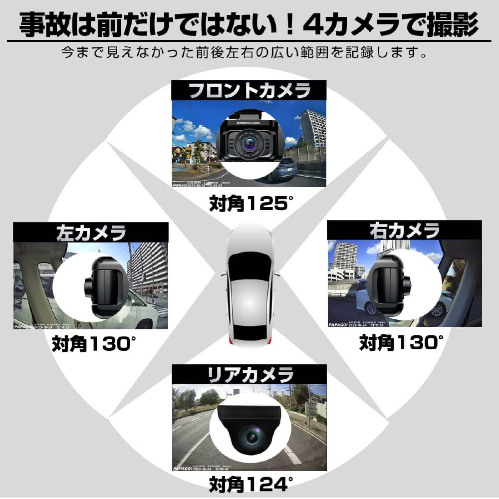 事故は前だけではない!防水リアカメラ対応の4カメラドライブレコーダー「GoSafe 640GE」は、あおり運転やわりこみ、車道を走る自転車・バイク・キックボード、側面衝突、ドアパンチなど前後左右4カメラで万が一の時を記録します。カメラ別で記録することにより、歪みの少ない鮮明な映像が録画できます。さらに、長い販売実績を持つパパゴの防水リアカメラは車内・車外どちらにも設置可能。お客様からのご要望に応え、前モデル「GoSafe 640G」をさらに進化させたモデルになります。リアカメラケーブルは6m、16mの2つの長さで、軽自動車から大型バンまで幅広い車種に対応可能です(前方2K/400万画素、左/右/後方はフルHD/200万画素)。GPS内蔵式だから見た目スッキリ!最大256GB対応(付属64GB)。左右カメラの角度変更、夜間走行時に便利な赤外線撮影、3.16インチ液晶モニター、WDR、常時/衝撃時/ボタン録画、Gセンサー、LED信号対策、地デジ対策、防犯対策機能(※要配線)など必要な機能を装備。取り付けは2カメラと同様のため、作業や工賃も手軽です。2年保証、内張り剥がし、配線クリップ、ドライブレコーダー搭載ステッカーなど特典付き。